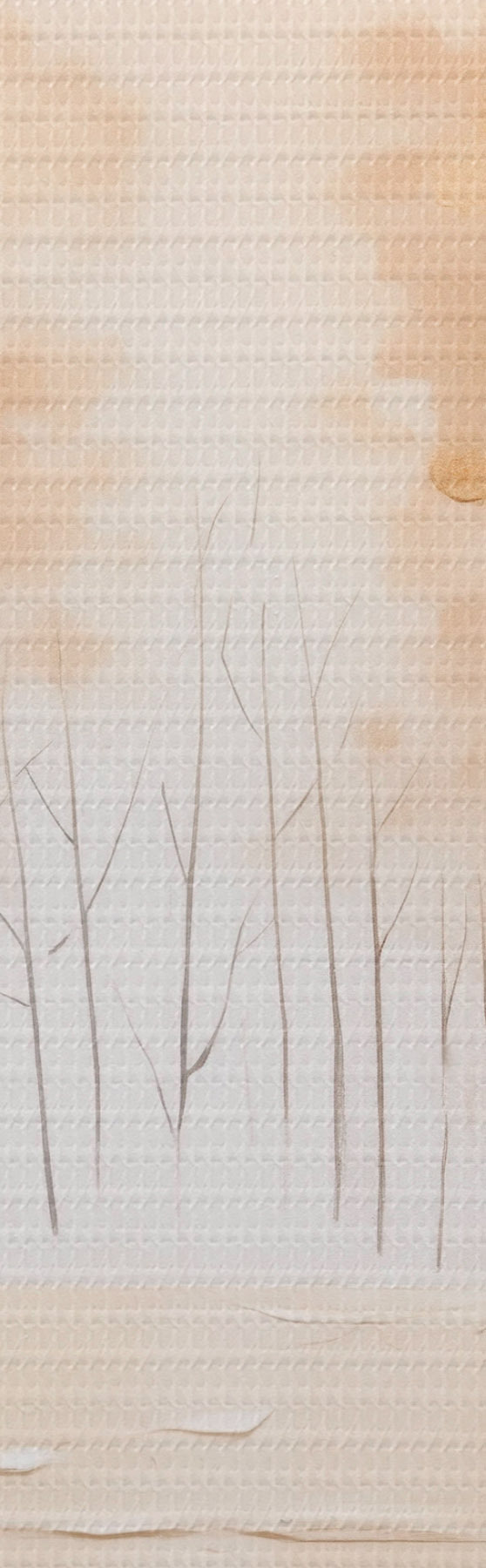 carta da parati Pittura a olio imitazione di alberi marroni con foglie bianche in una foresta con un fiume al centro, sfondo bianco nr. s43172