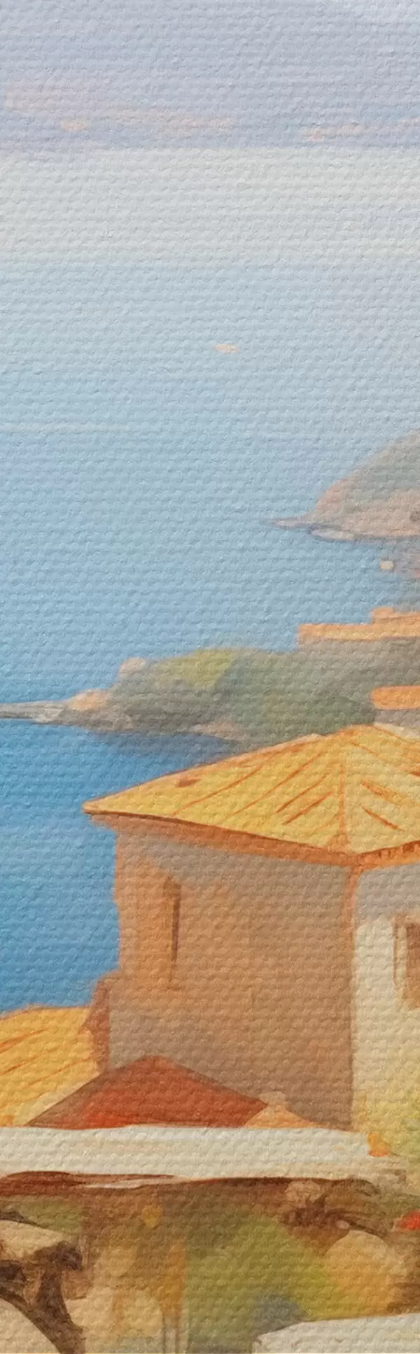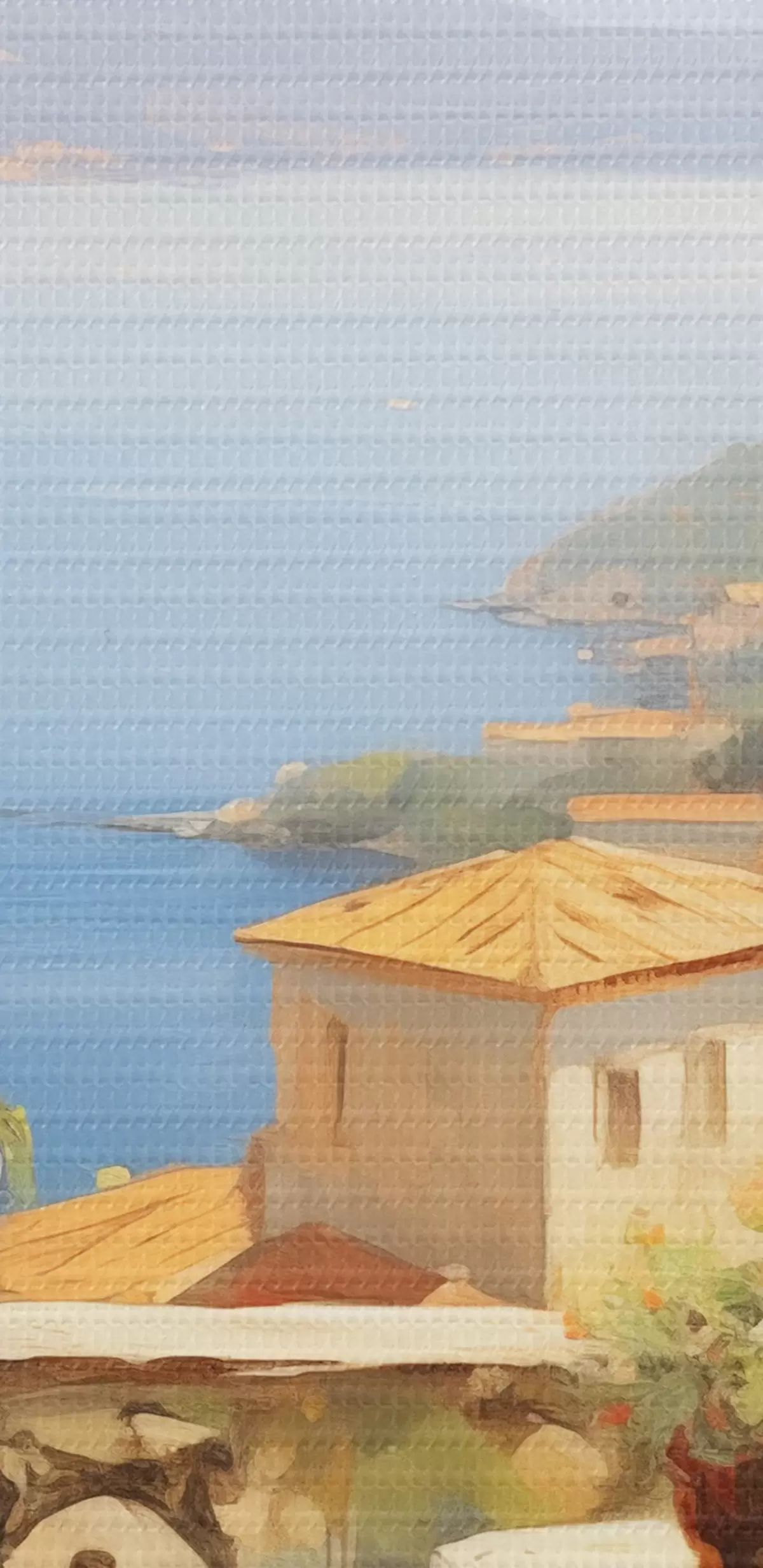 Quadri Pittura ad olio imitazione di balcone con fiori, con vista sul mare, case sulla costa, giornata di sole, cielo blu Nr s43173