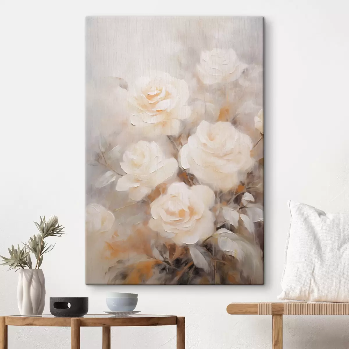 Quadri Rose bianche con petali morbidi, con uno sfondo di colori tenui e forme sfocate, che creano un effetto sognante Nr s43177