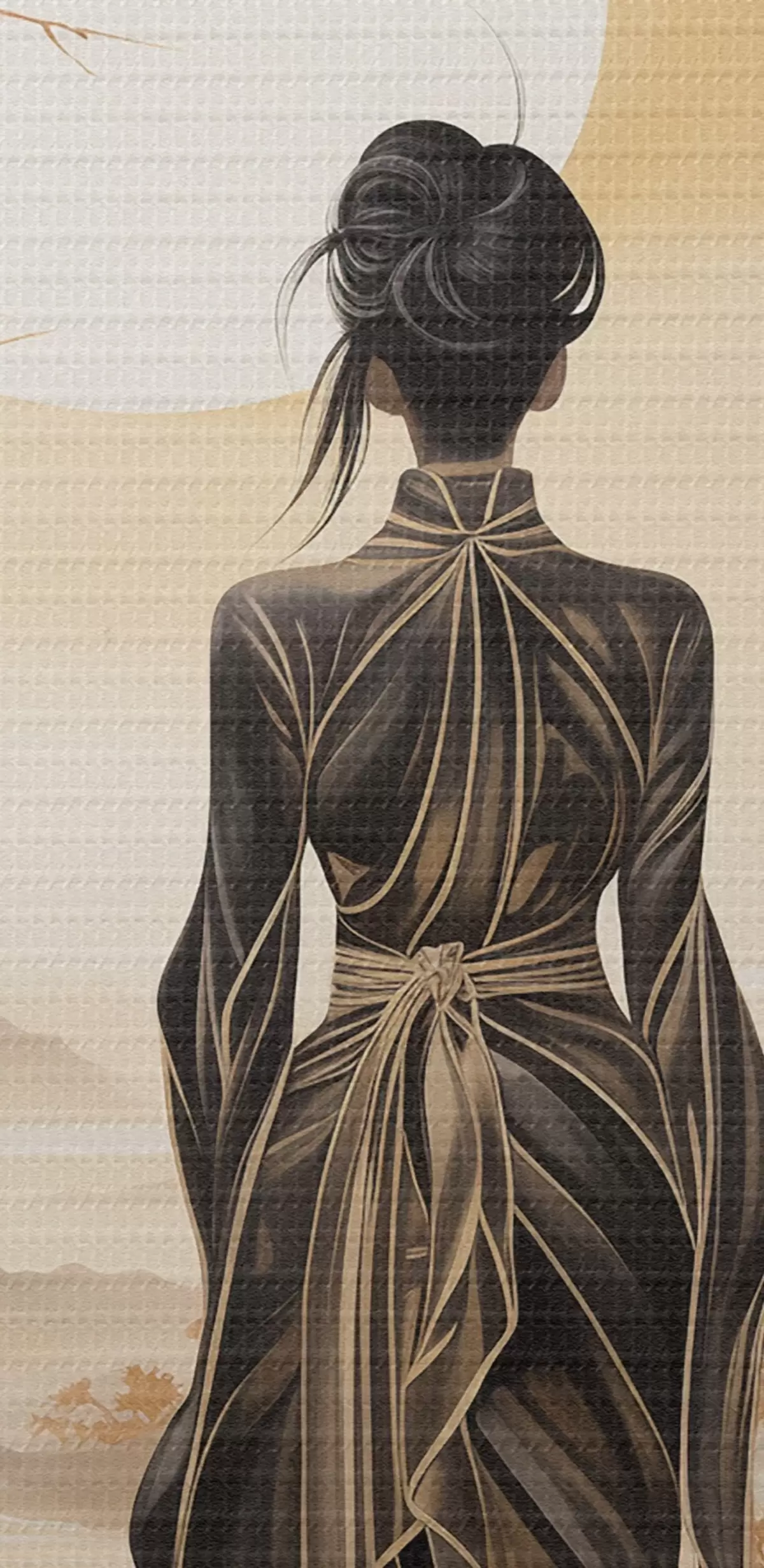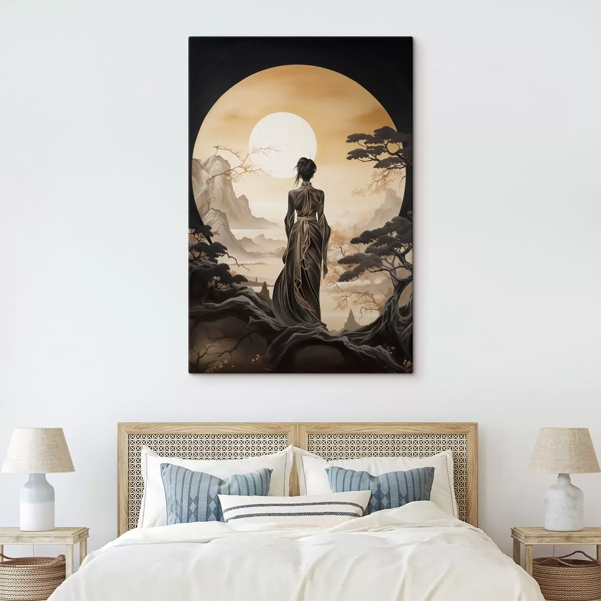 Quadri Persone, Giappone, ragazza al tramonto sullo sfondo di sakura e montagne Nr s43256