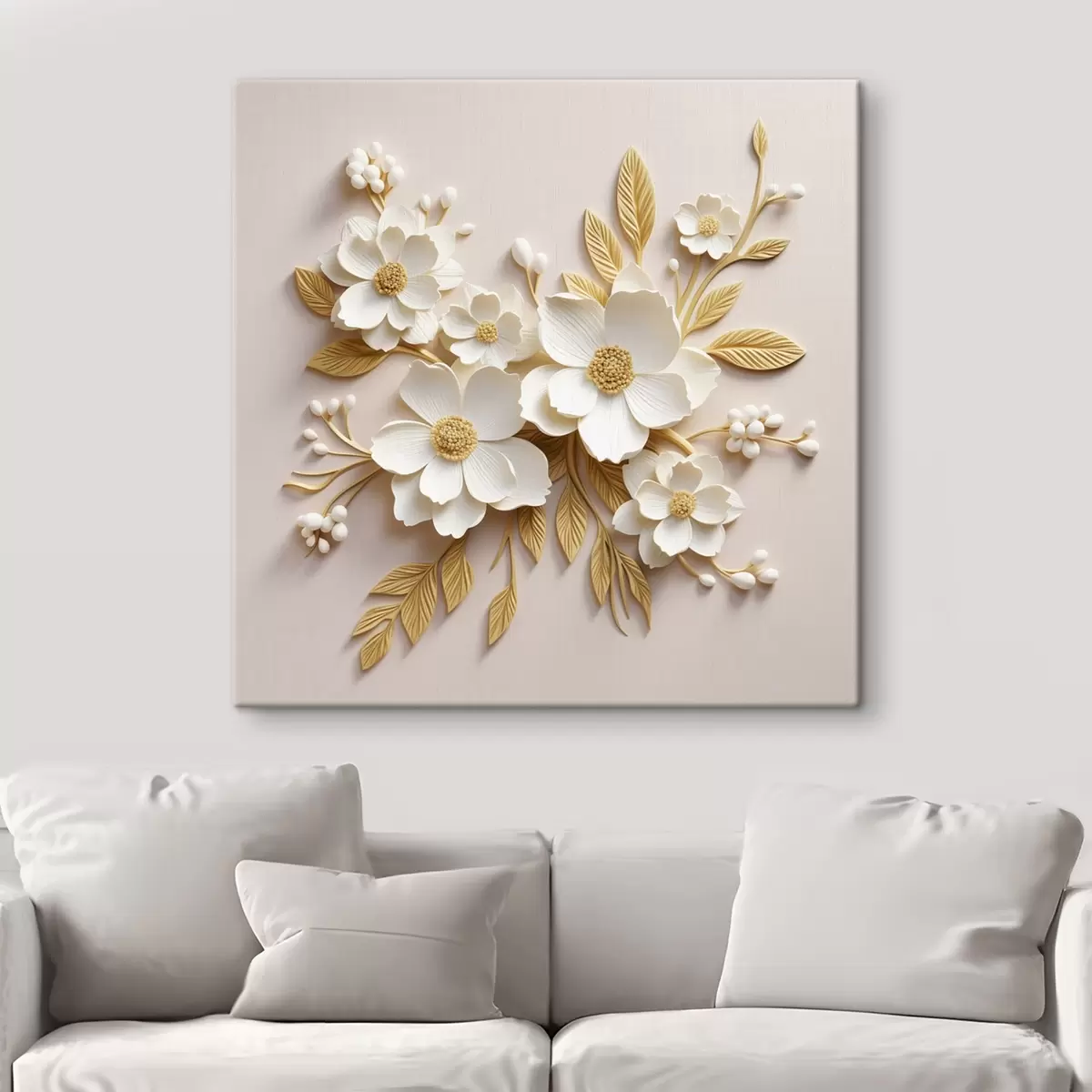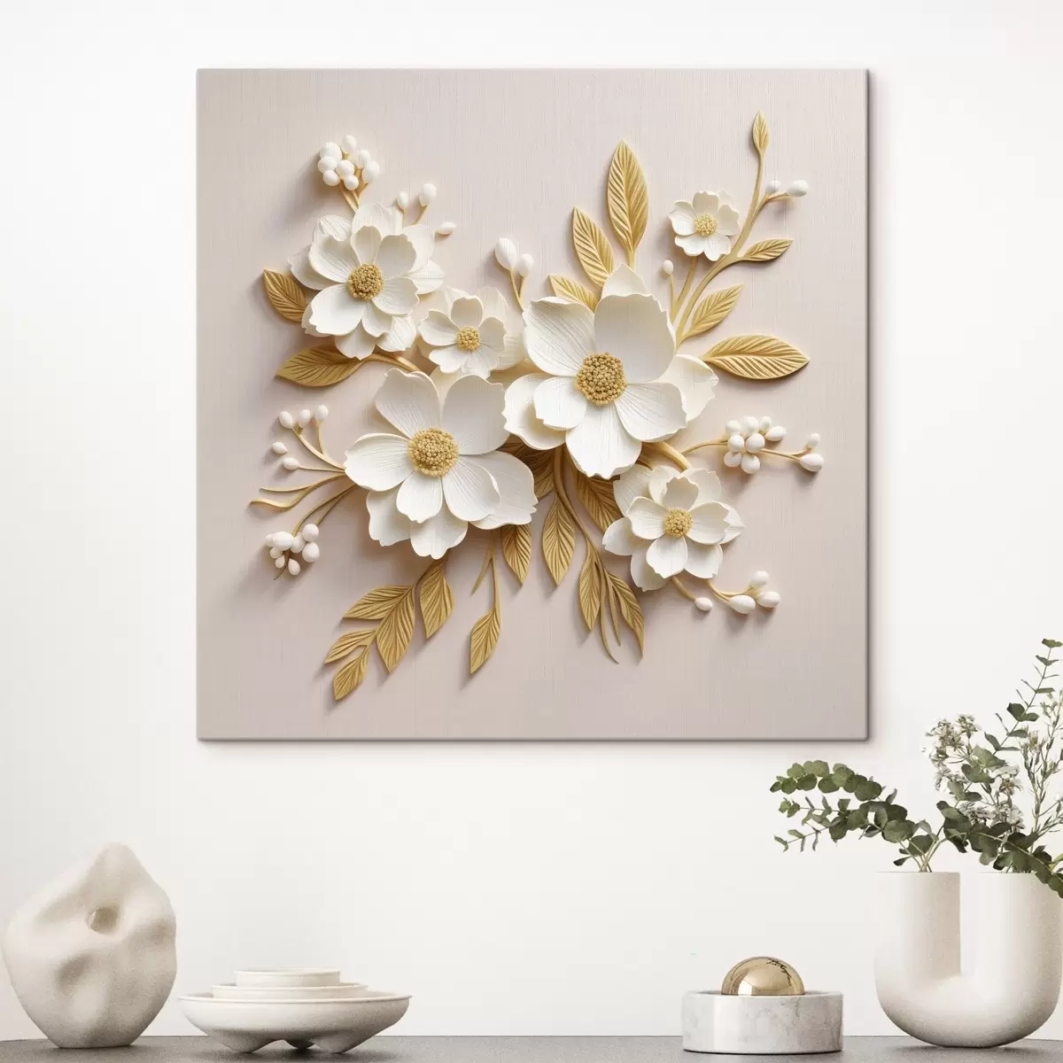 Quadri fiori bianchi 3D con foglie su sfondo crema Nr s43383
