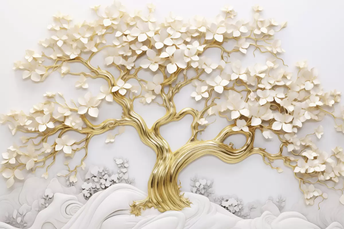 carta da parati Albero decorativo con fiori bianchi, sfondo bianco, rocce bianche, dettagli intricati, arte ispirata alla natura nr. s43388