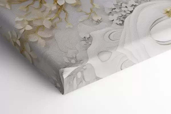 Quadri Albero decorativo con fiori bianchi, sfondo bianco, rocce bianche, dettagli intricati, arte ispirata alla natura Nr s43388