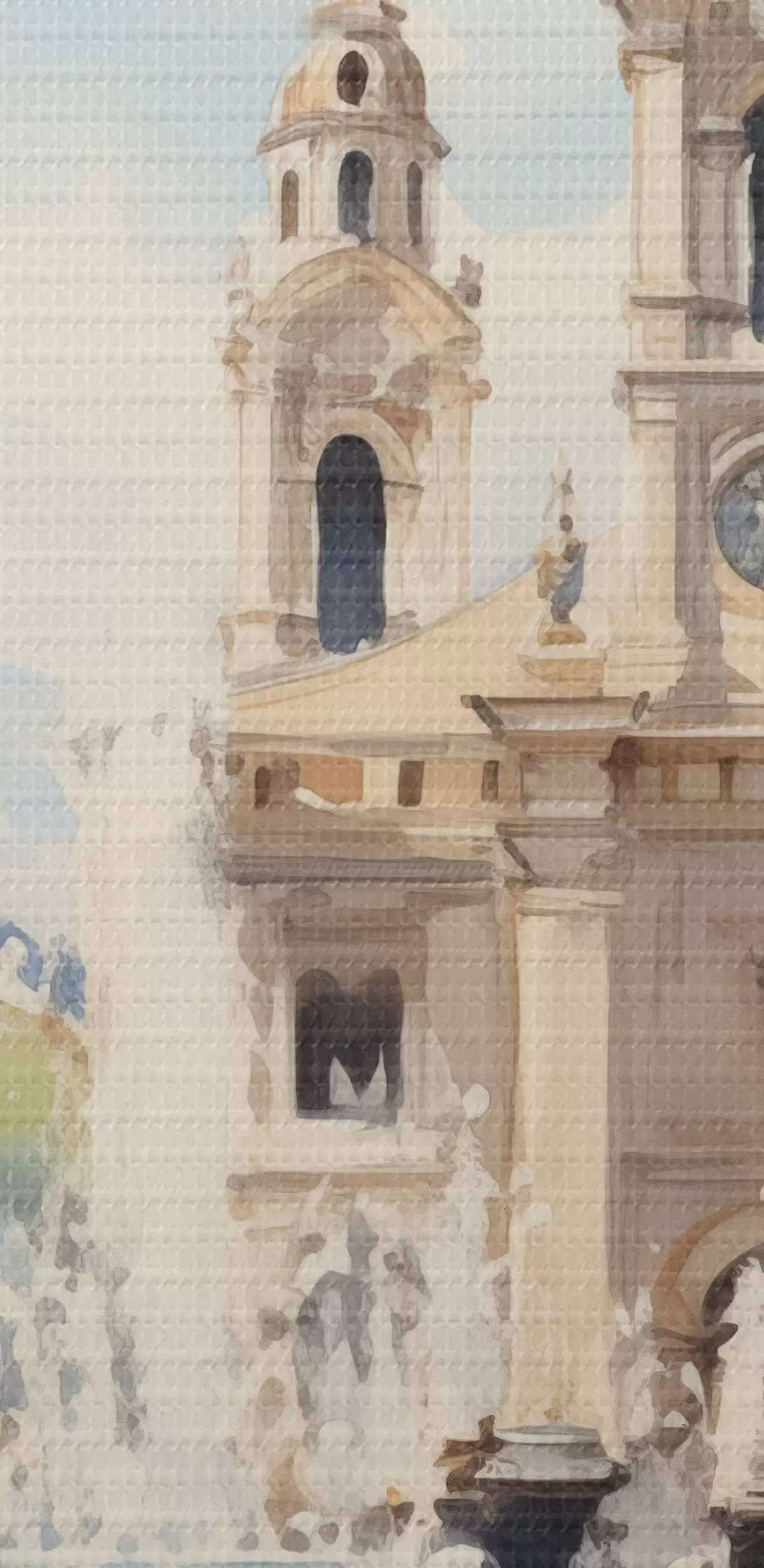 Quadri Paesaggio urbano astratto con torre e fontana in una piazza, montagne in lontananza, stile acquerello Nr s43397