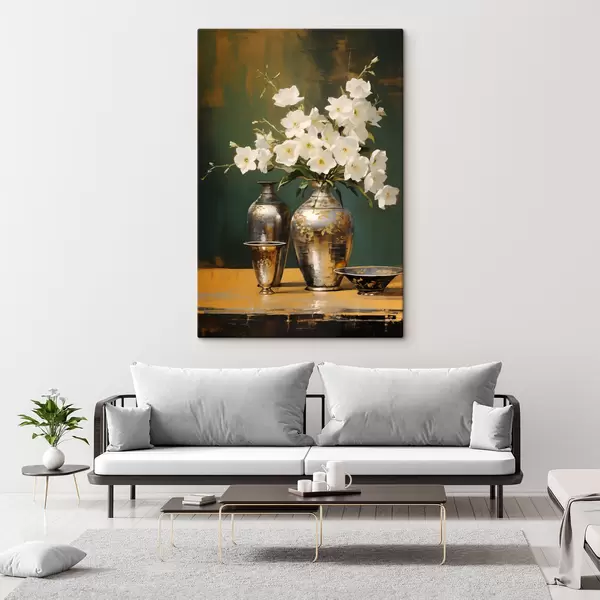 Quadri Natura morta di fiori bianchi in vaso, con vasi decorativi e una ciotola su un tavolo verde, sfondo verde scuro Nr s43408