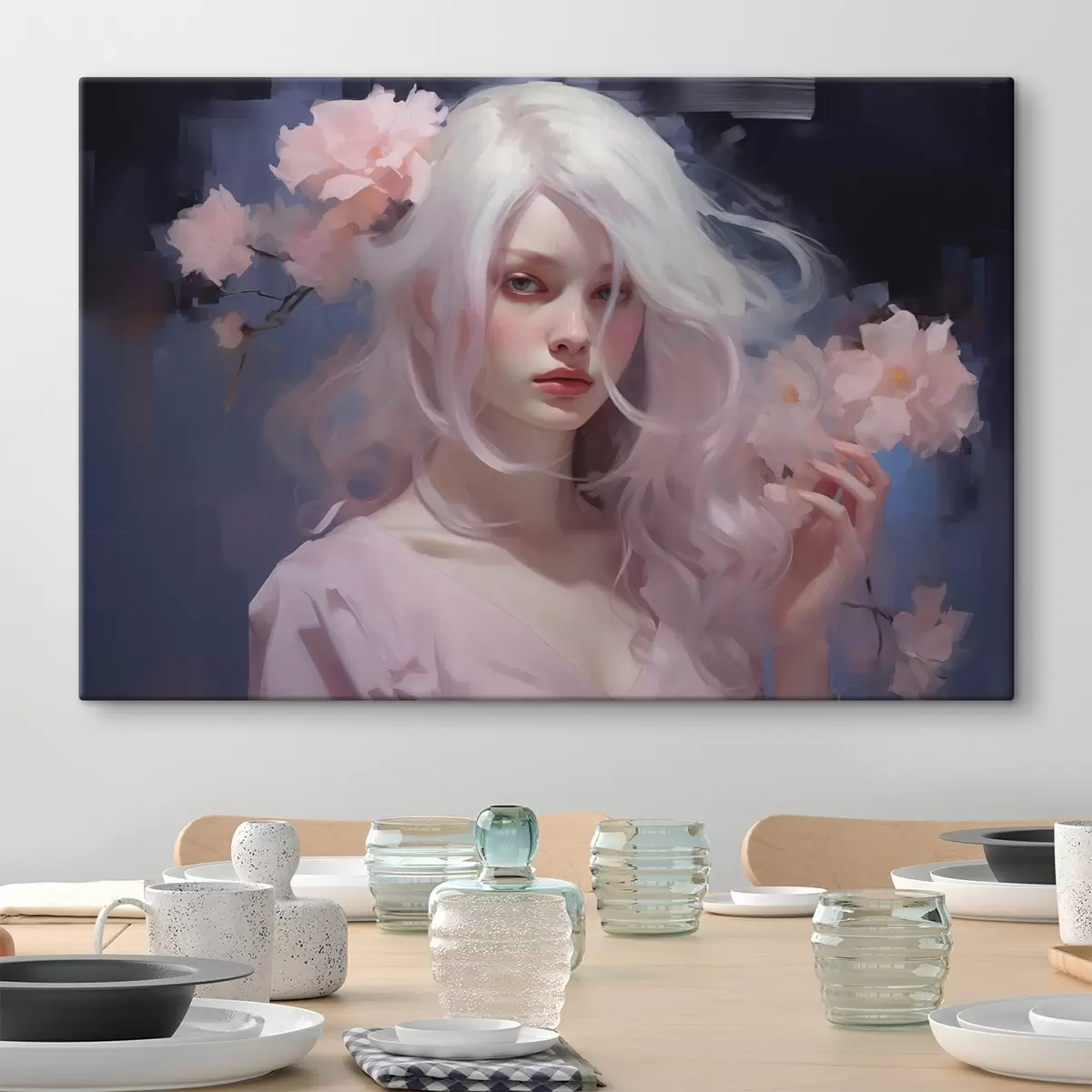 Quadri Ragazza con peonie, disegno in stile acrilico, sfondo scuro Nr s43496