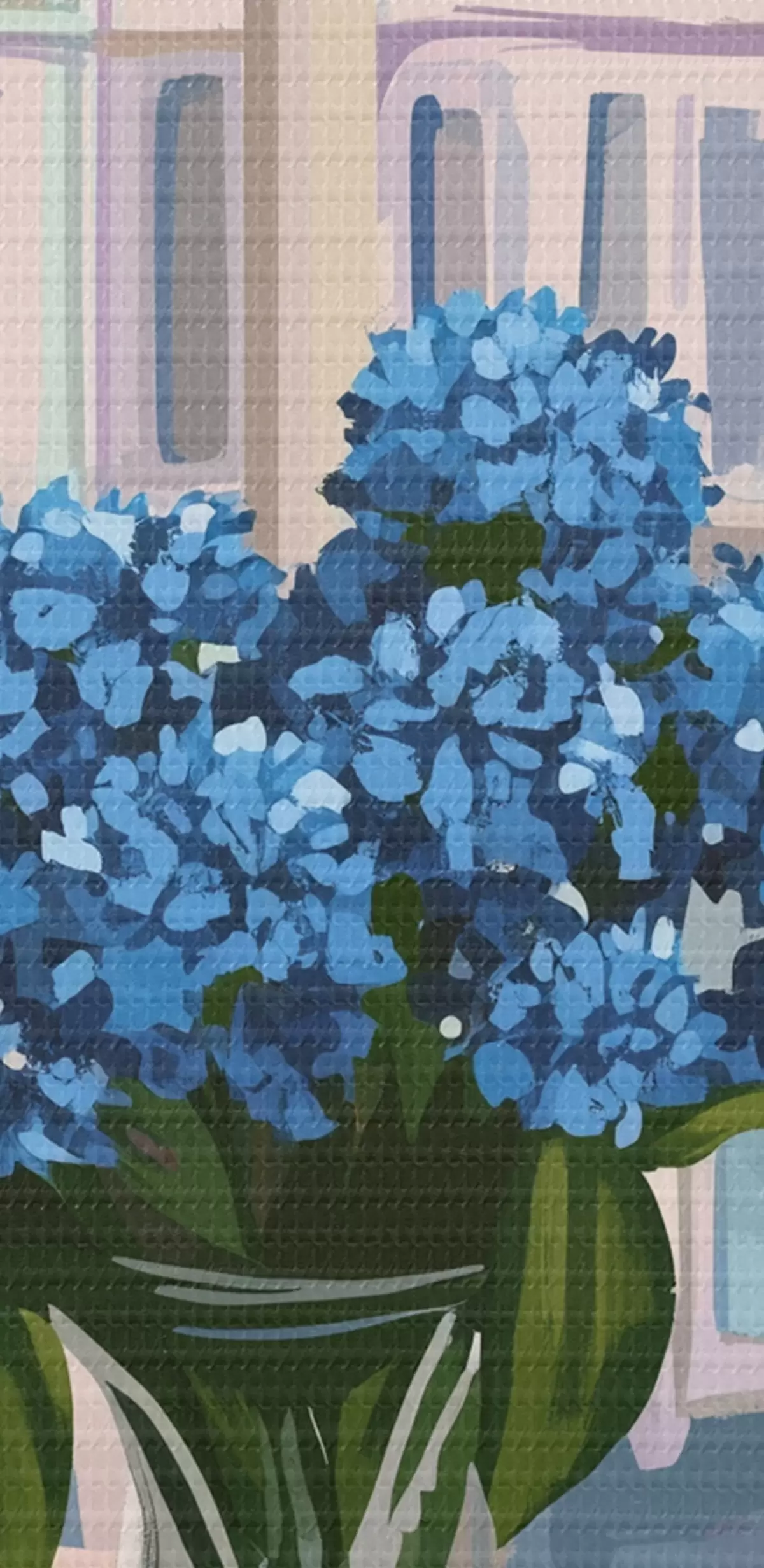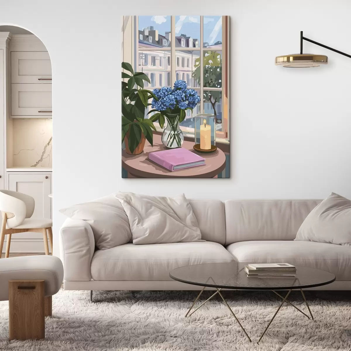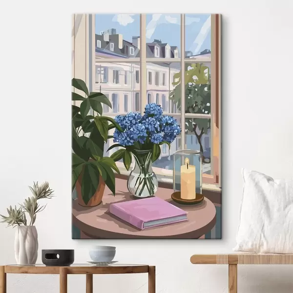 Quadri Ortensie nel vaso, vista dalla finestra, candela, casa accogliente Nr s44009