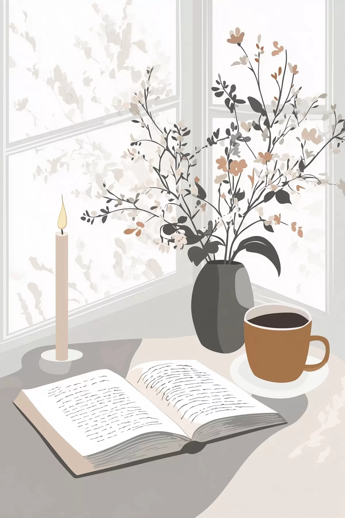 carta da parati Astrazione, libro aperto, vaso con fiori, candela, colori beige nr. s44011