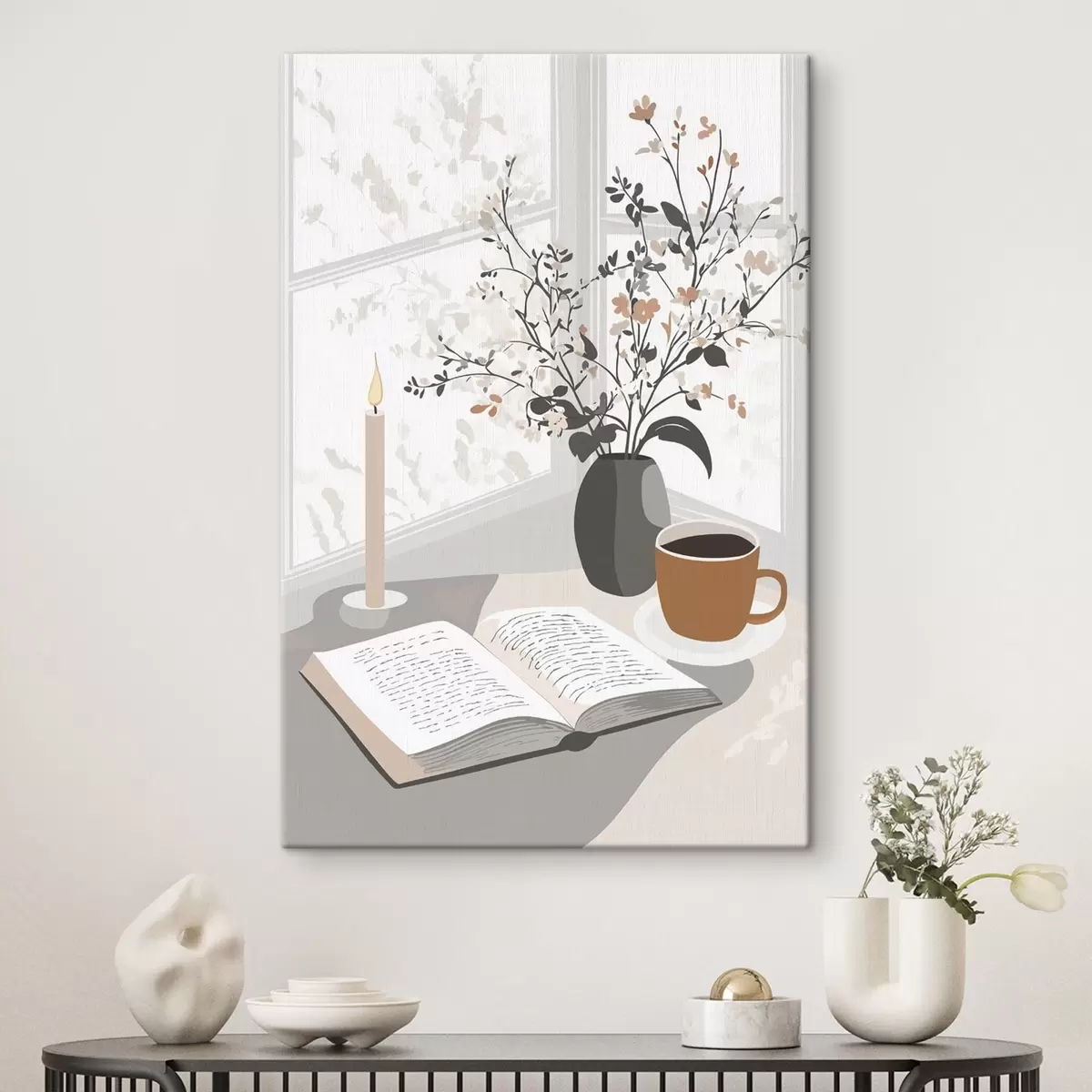 Quadri Astrazione, libro aperto, vaso con fiori, candela, colori beige Nr s44011