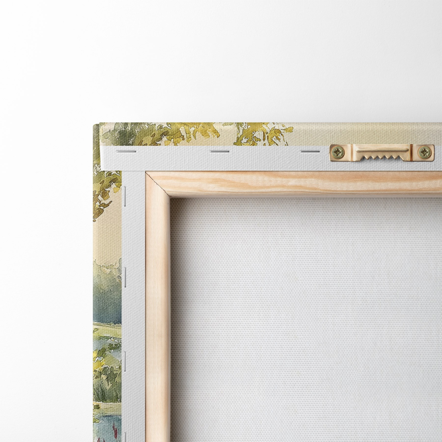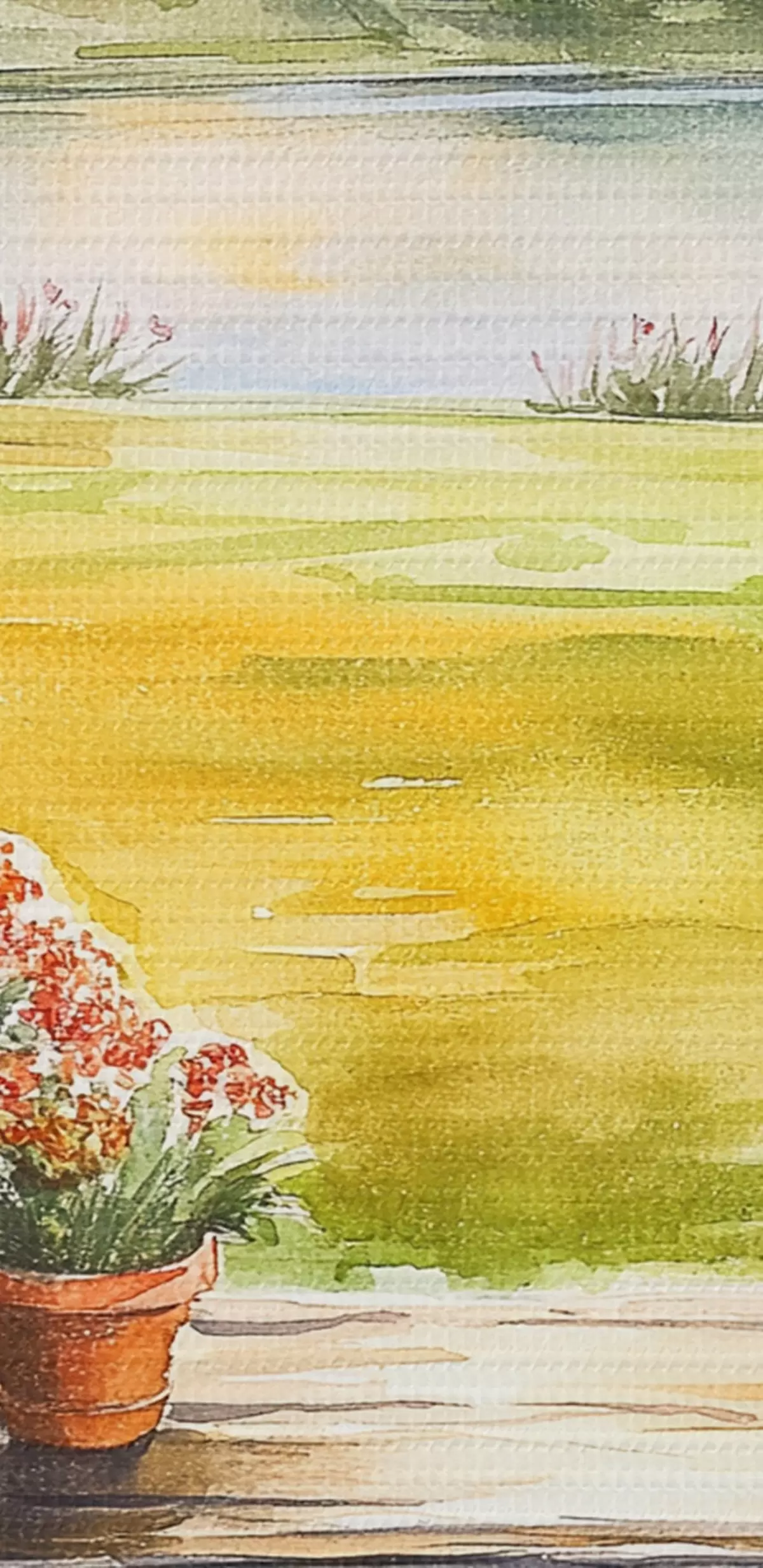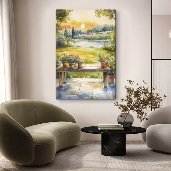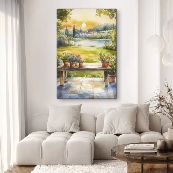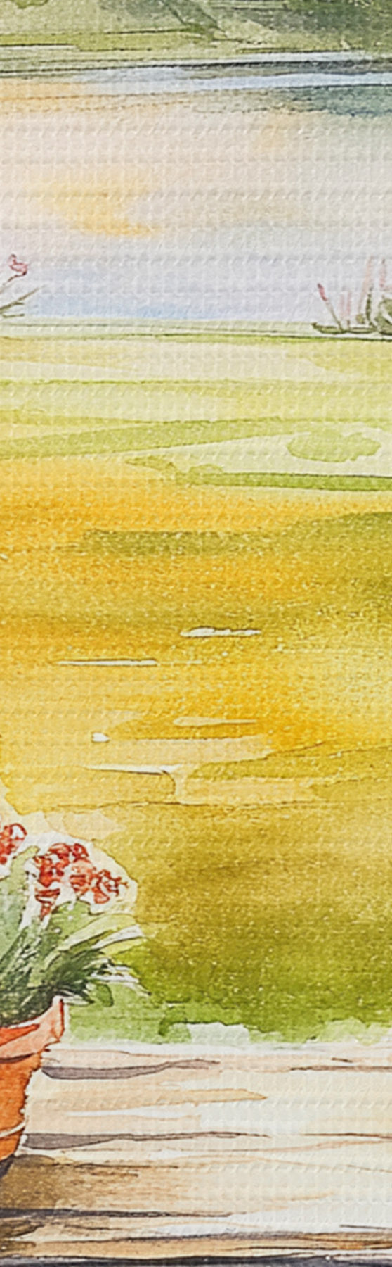 Quadri Villaggio al tramonto, rustico, fiori estivi, lago, stile acquerello Nr s44016