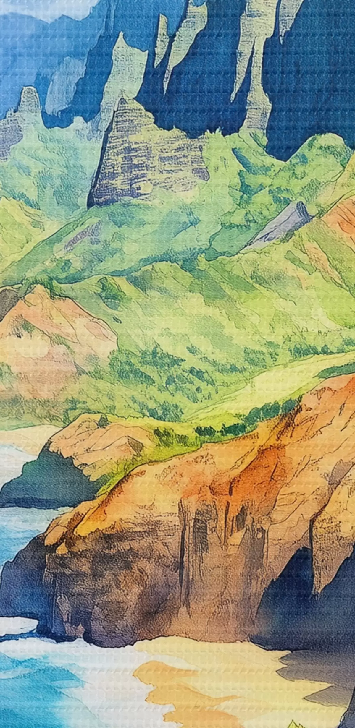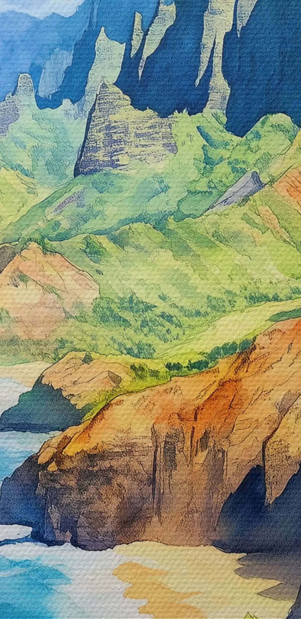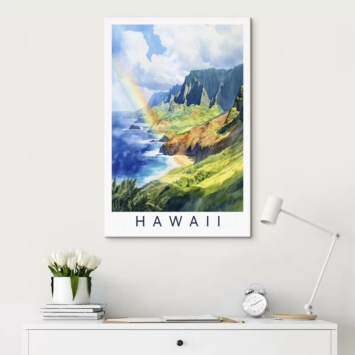 Quadri Isola delle Hawaii, stile acquerello, arcobaleno, montagne verdi, oceano Nr s44141