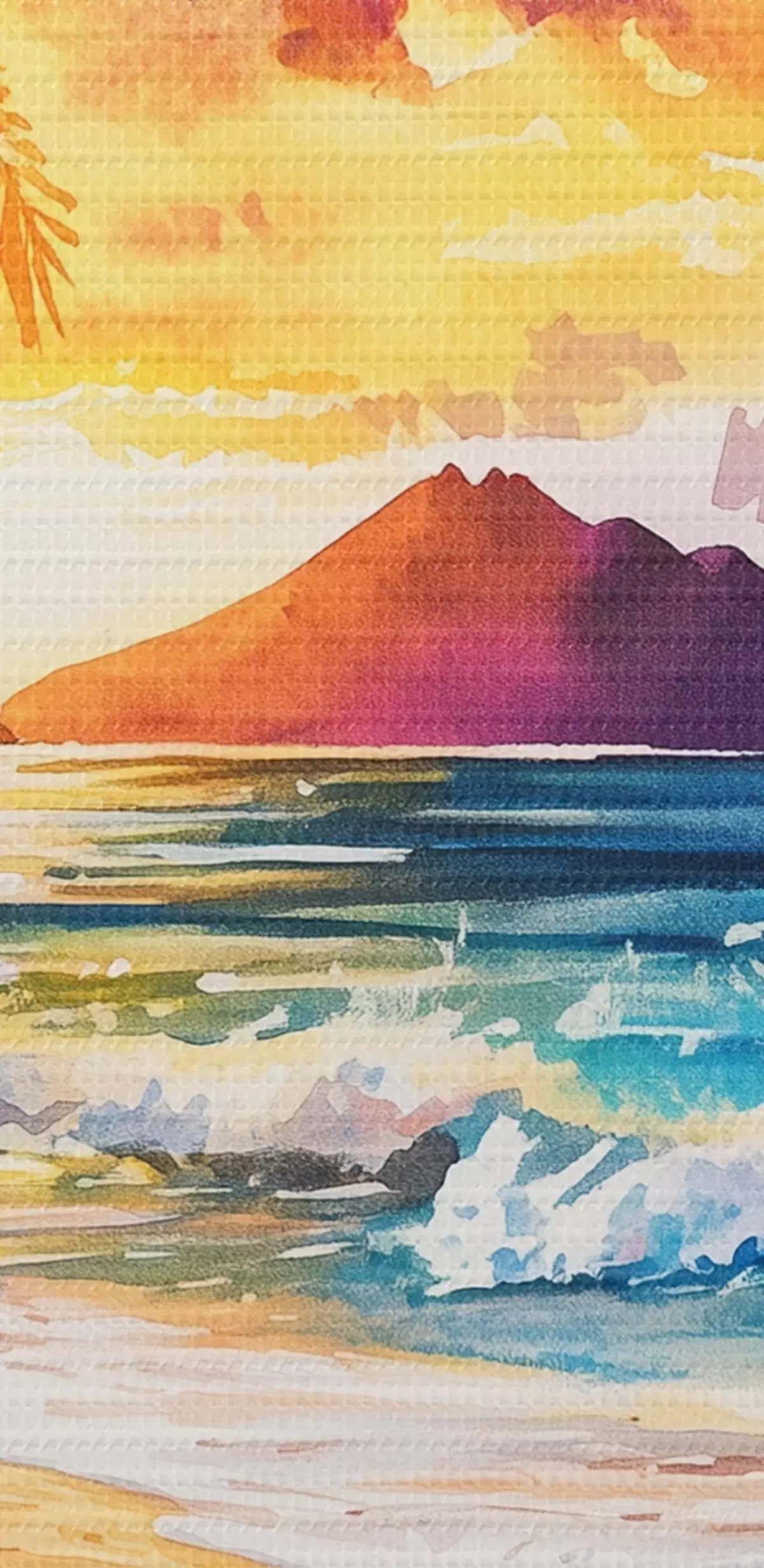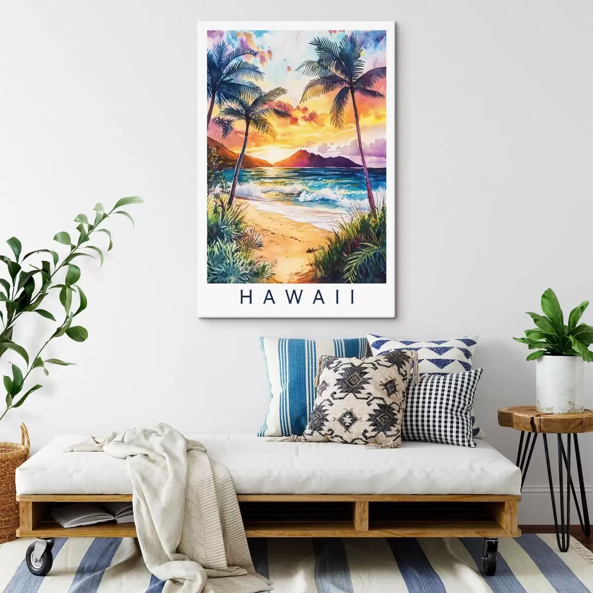 Quadri Tramonto sull'isola delle Hawaii, palme, oceano, cielo colorato, stile acquerello Nr s44142