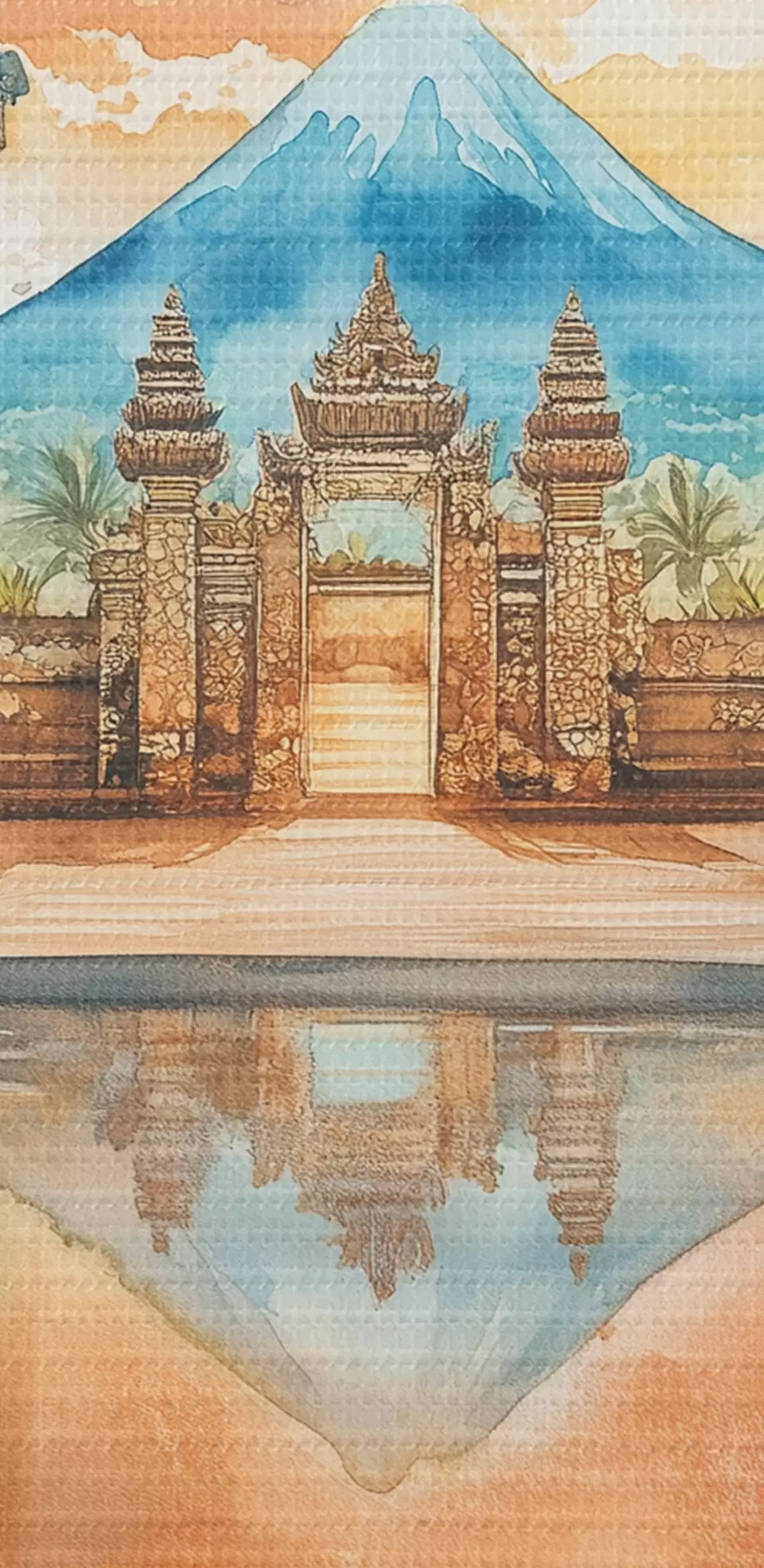 carta da parati Estetica di Bali, tempio, cielo al tramonto, natura tropicale, stile acquerello nr. s44149