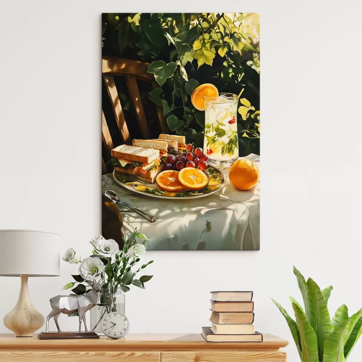 Quadri Picnic estetico nel giardino estivo, panini, arance e limonata Nr s44306