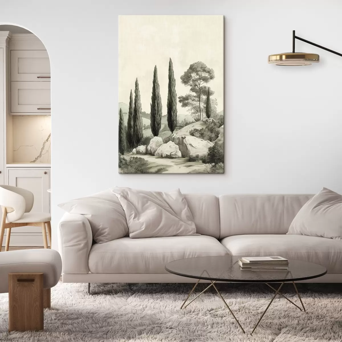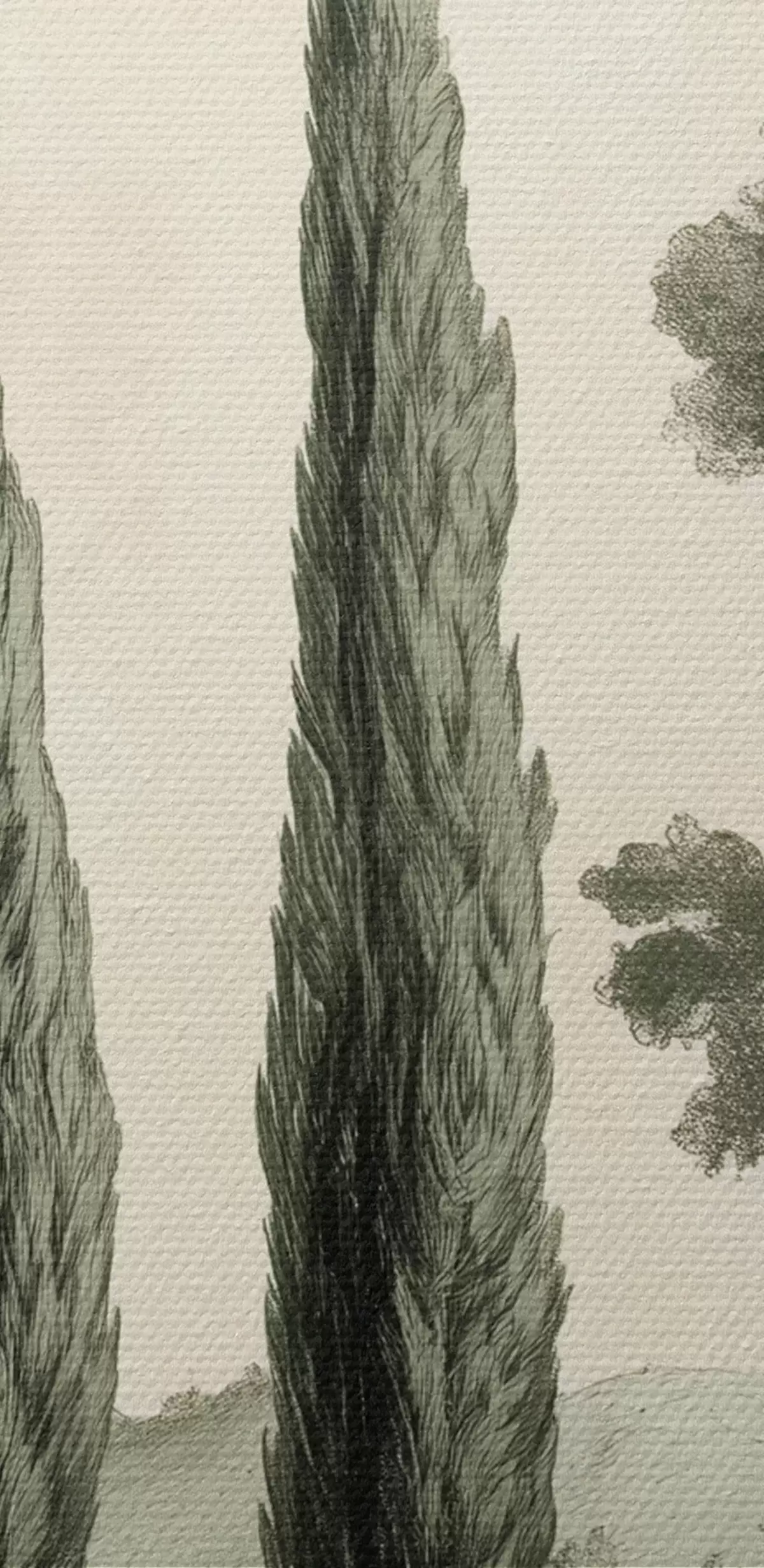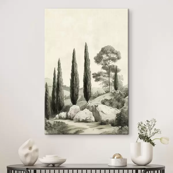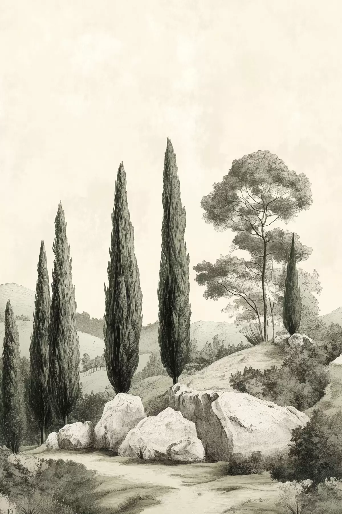 carta da parati Paesaggi toscani, colori pastello, cipressi, rocce, stile rustico nr. s44307