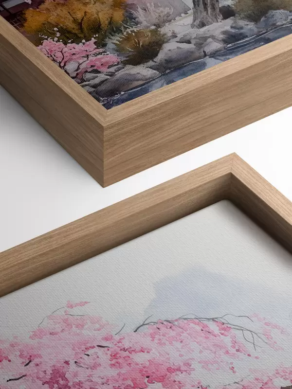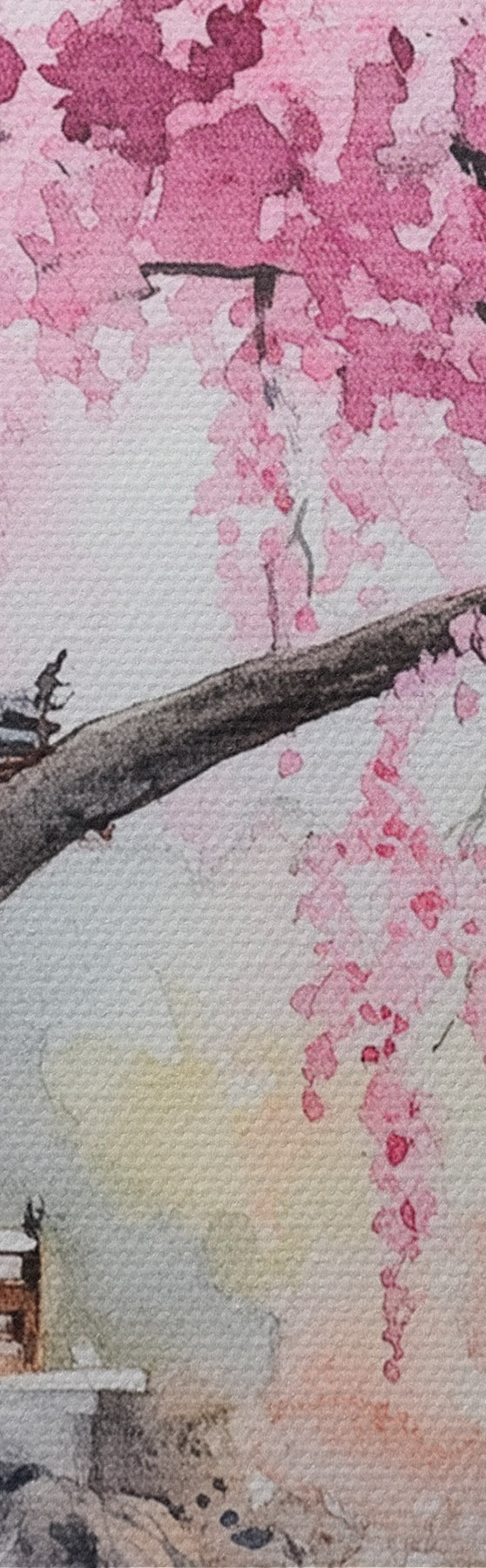 Quadri Albero di ciliegio rosa vicino alla casa sul lago, Giappone, stile orientale, acquerello Nr s44312