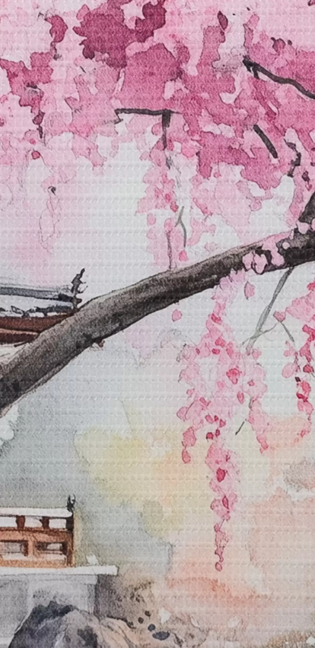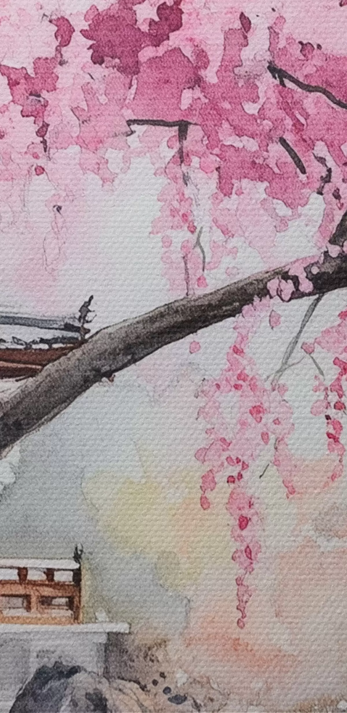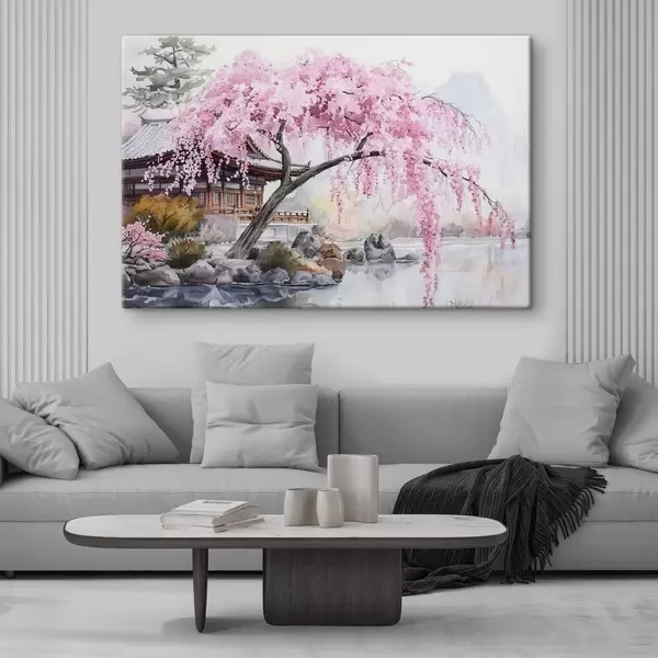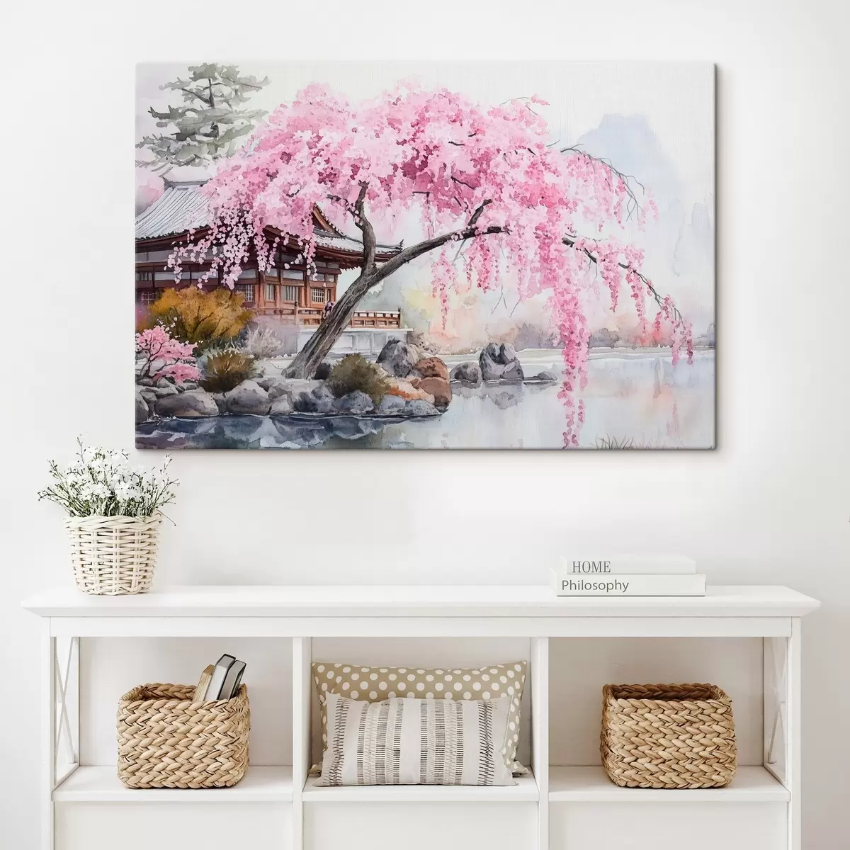 Quadri Albero di ciliegio rosa vicino alla casa sul lago, Giappone, stile orientale, acquerello Nr s44312