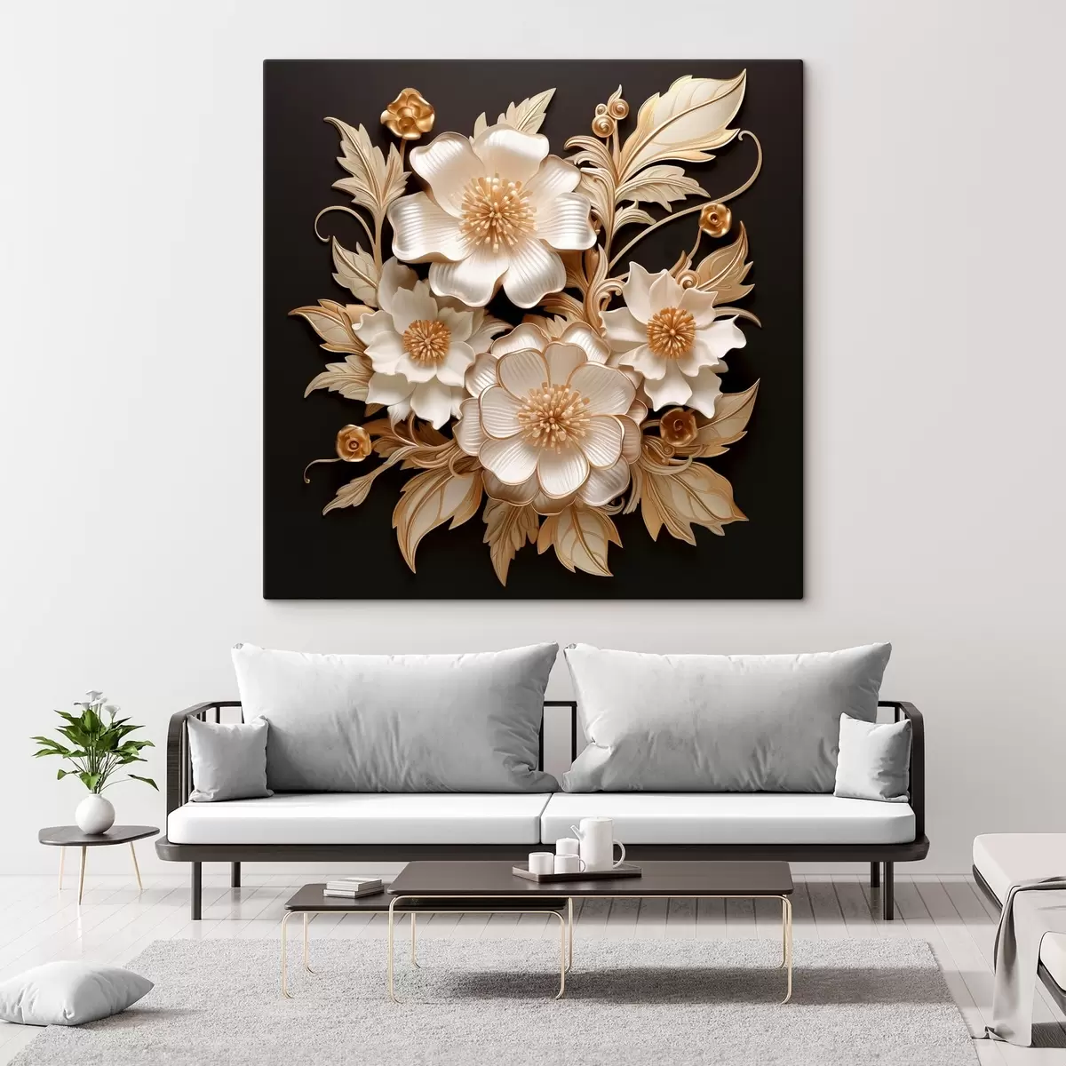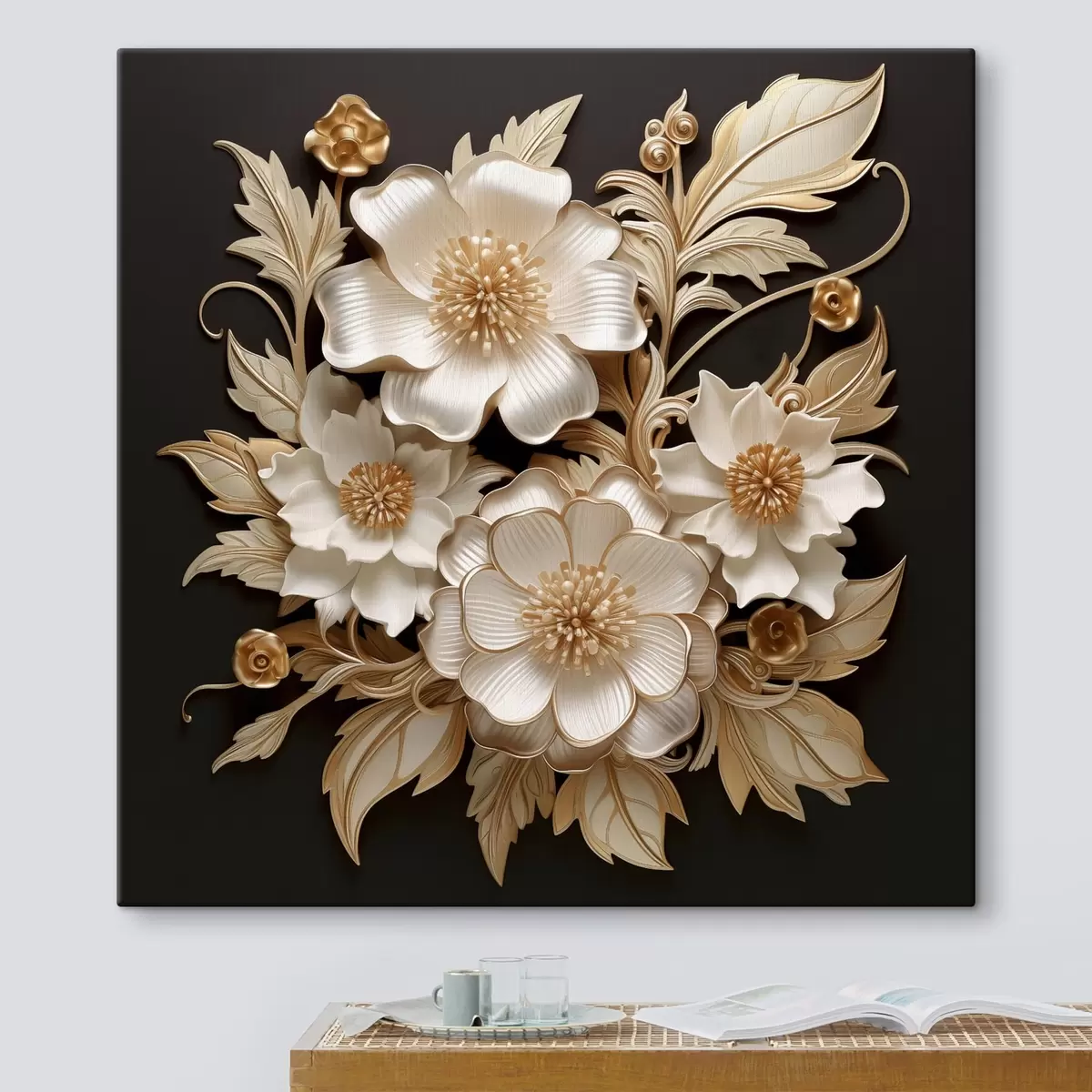 Quadri Voluminosi fiori bianchi su sfondo nero Nr s44340