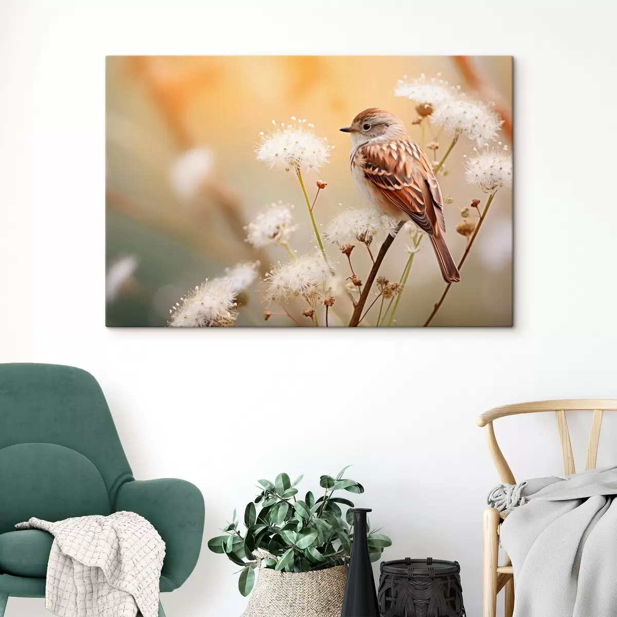 Quadri Uccello appollaiato su un ramo con fiori bianchi, soft focus, sfondo naturale Nr s44393