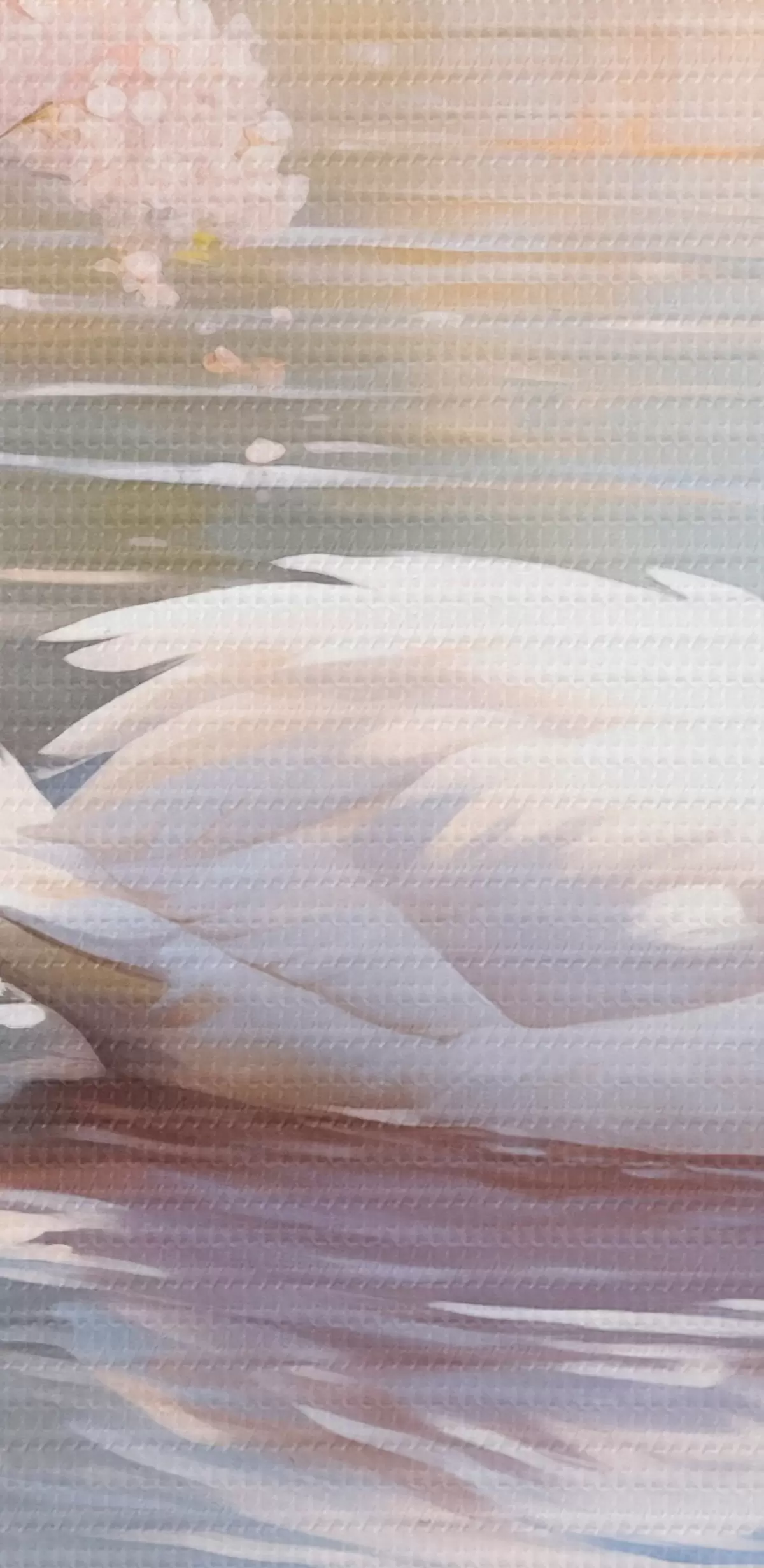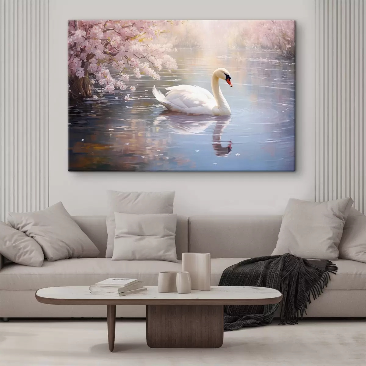 Quadri Un cigno bianco che nuota in un lago con alberi di ciliegio in fiore, colori pastello Nr s44396