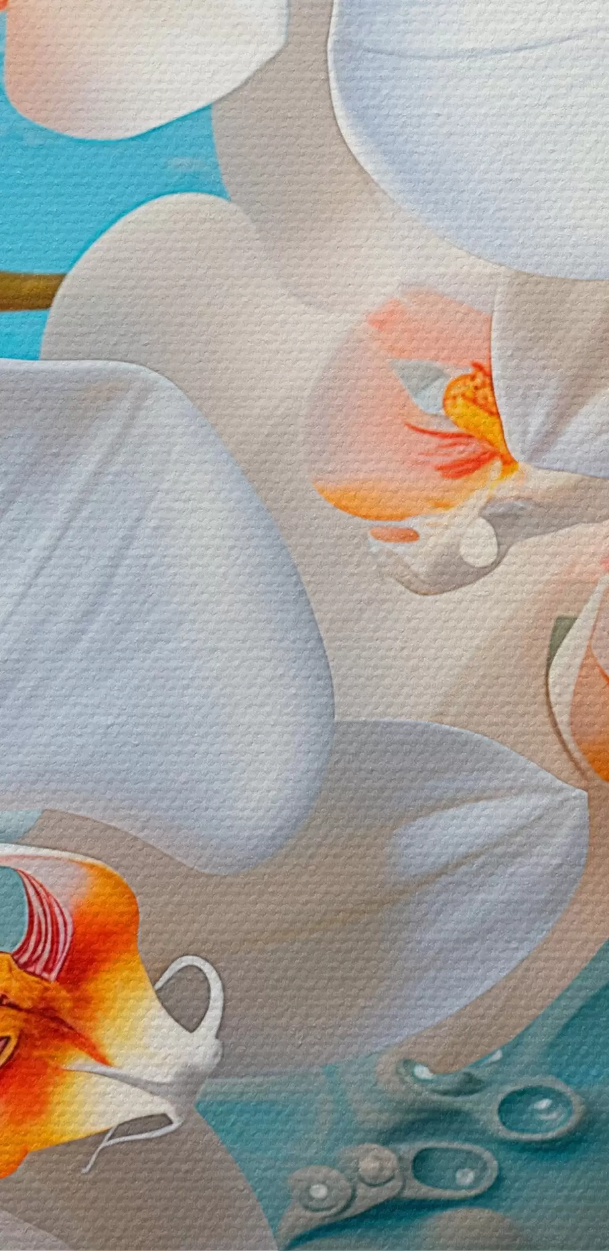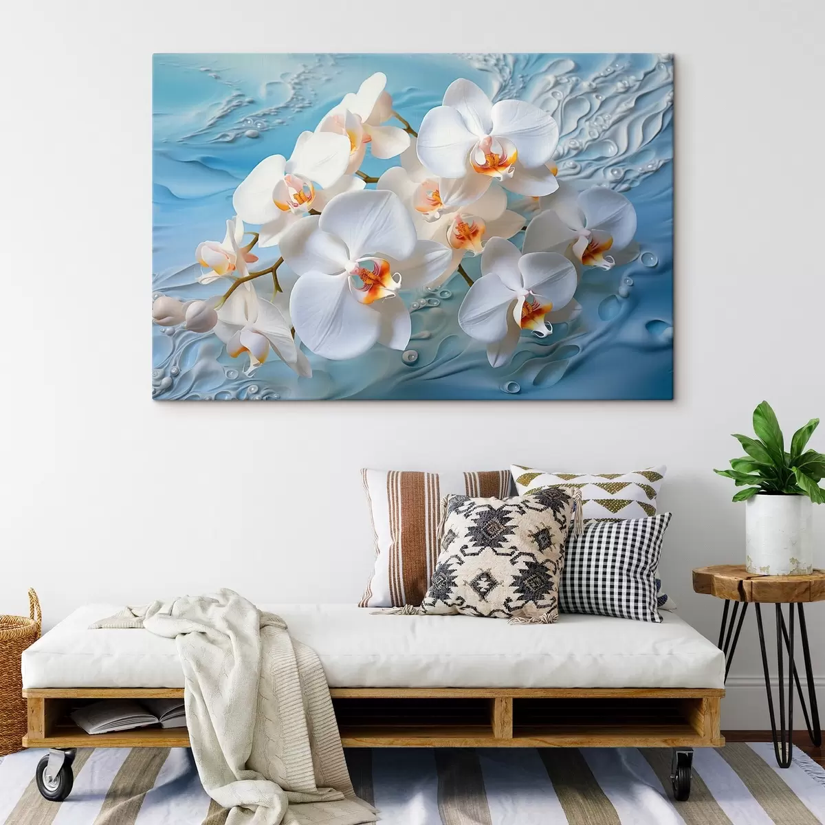 Quadri Orchidee bianche, disposte su una superficie azzurra con gocce d'acqua, illuminazione soffusa Nr s44401