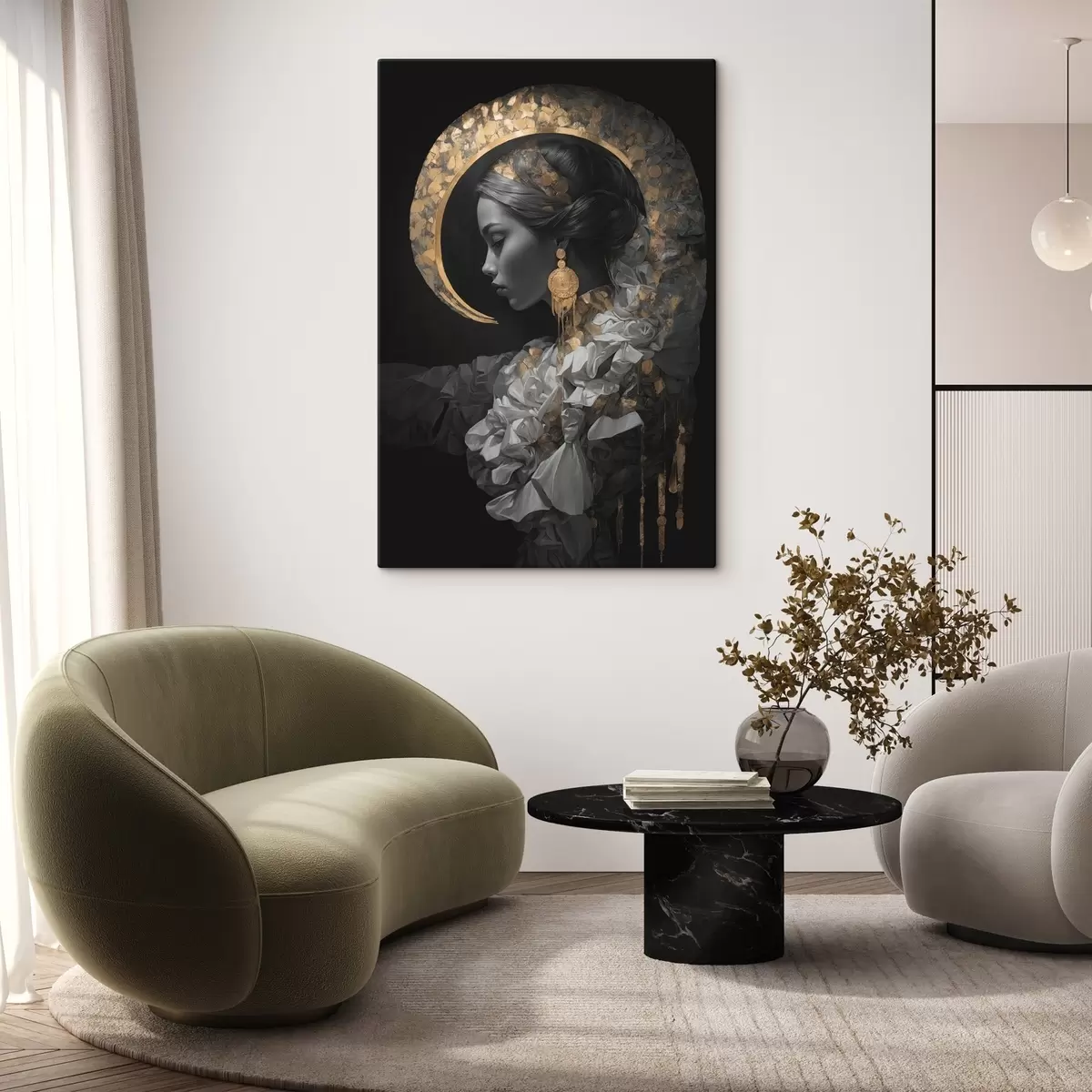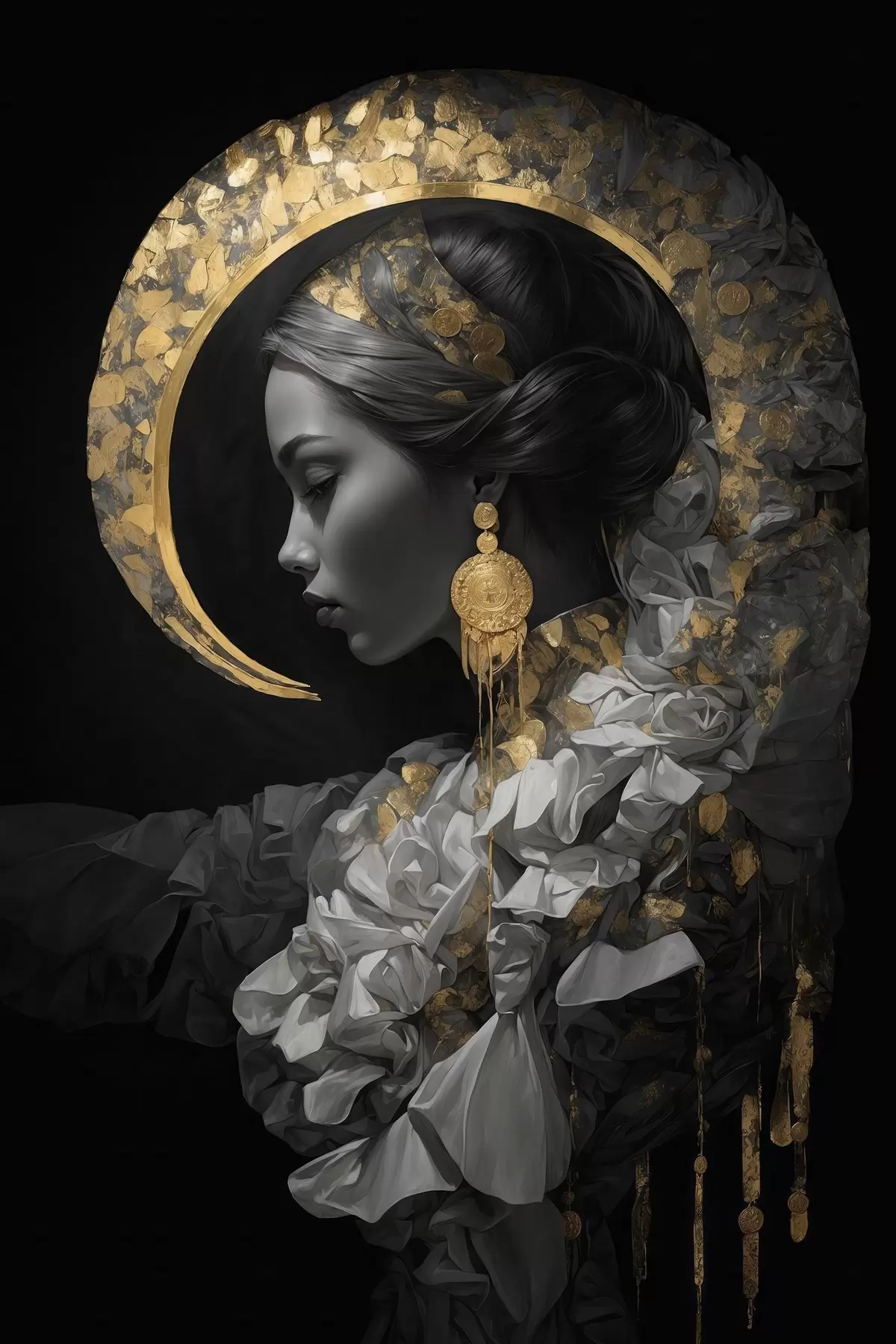 Quadri Ragazza e luna crescente gialla su sfondo nero Nr s44449