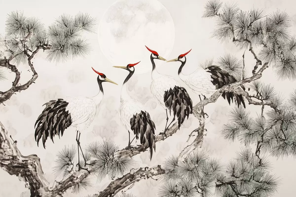 carta da parati Arte cinese con gru e pini, stile orientale, natura nr. s44503