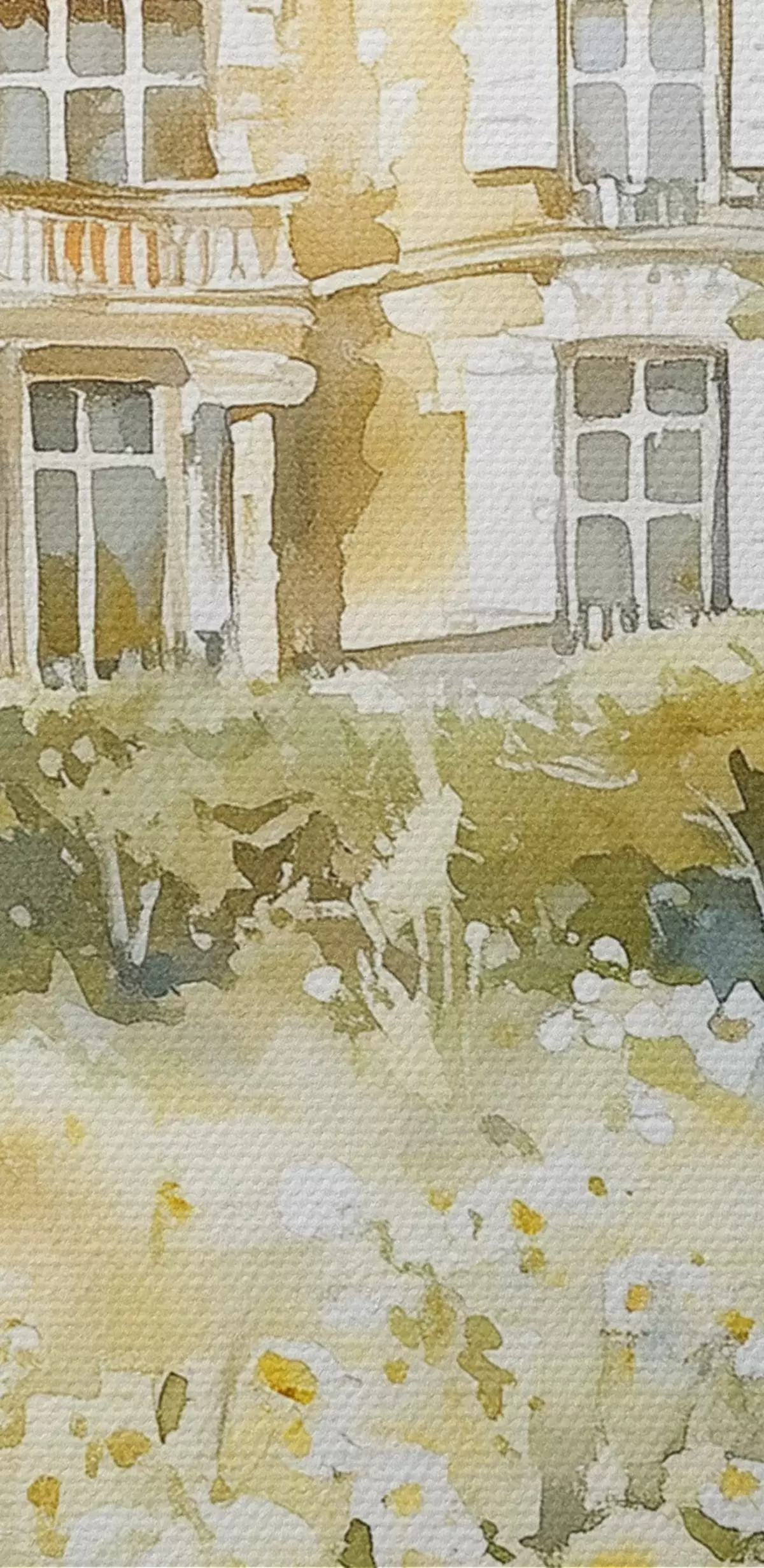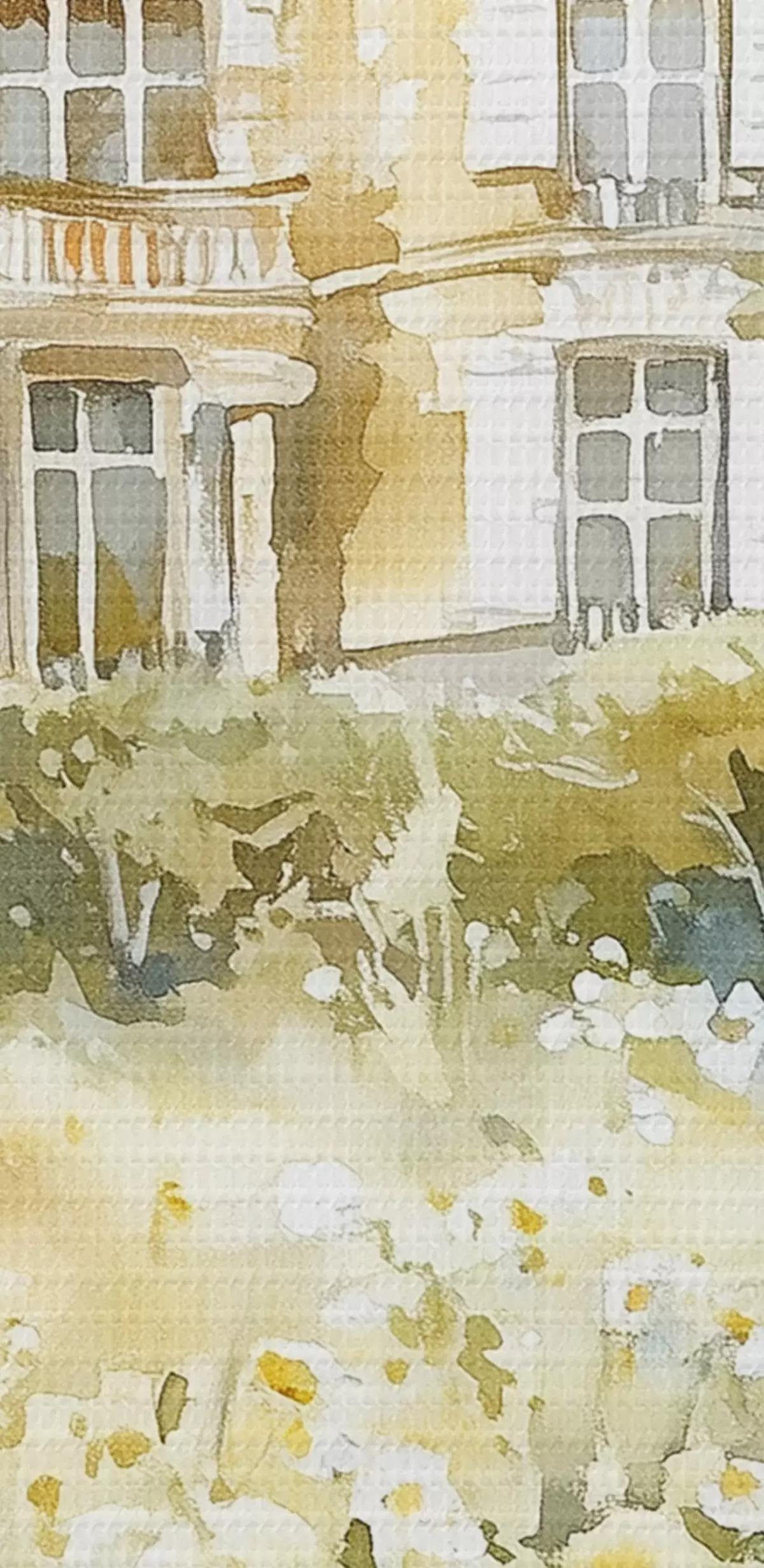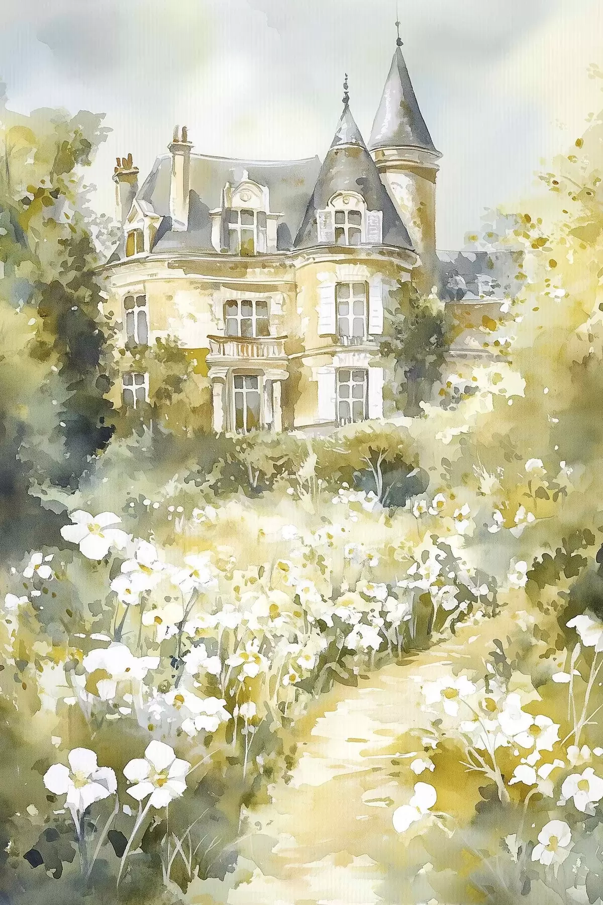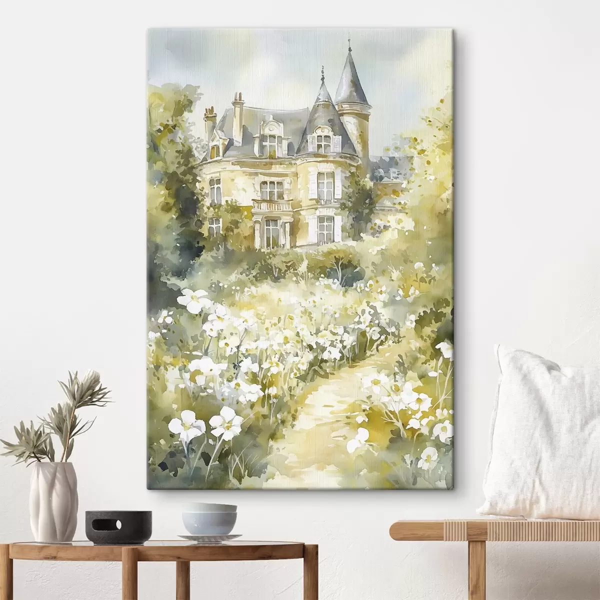 Quadri Bellissimo castello con fiori verdi e bianchi, stile acquerello Nr s44506