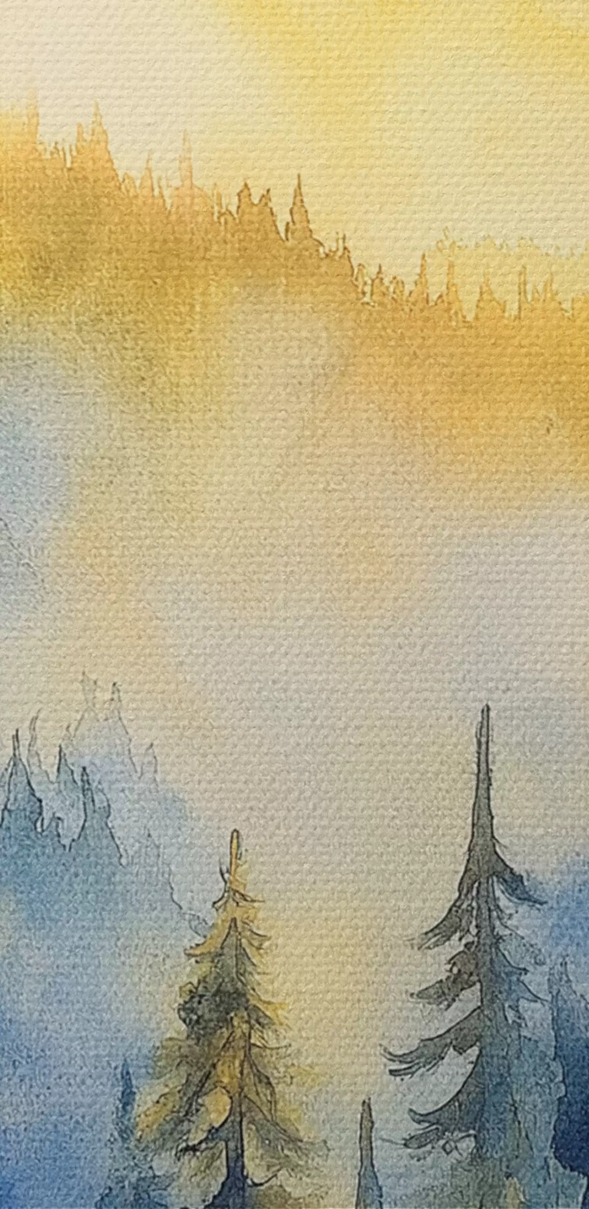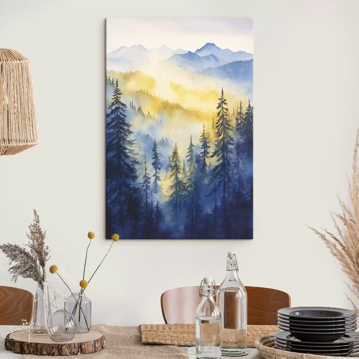 Quadri Montagne nebbiose all'alba, foreste di pini, colori blu e giallo Nr s44602