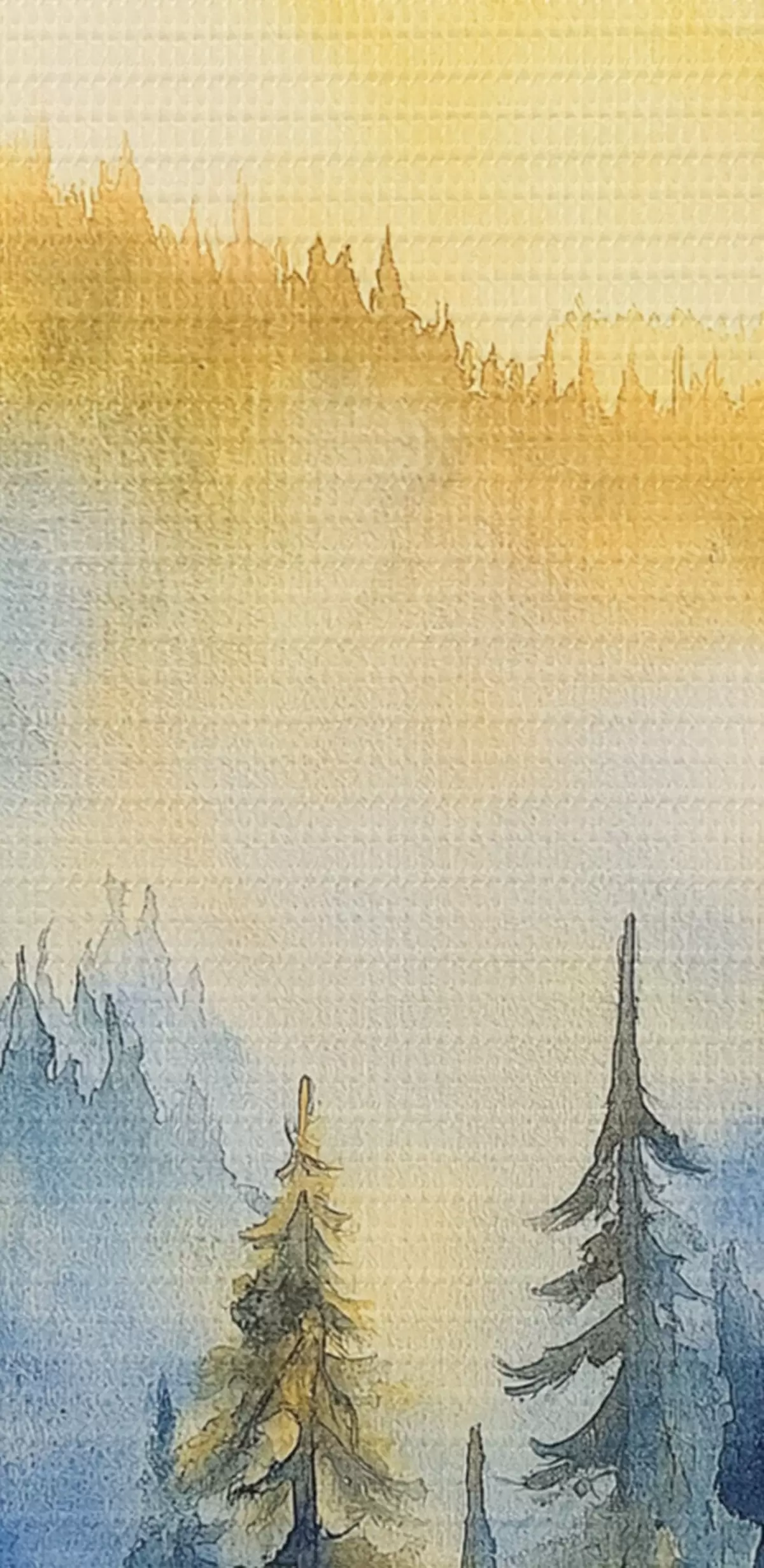 carta da parati Montagne nebbiose all'alba, foreste di pini, colori blu e giallo nr. s44602