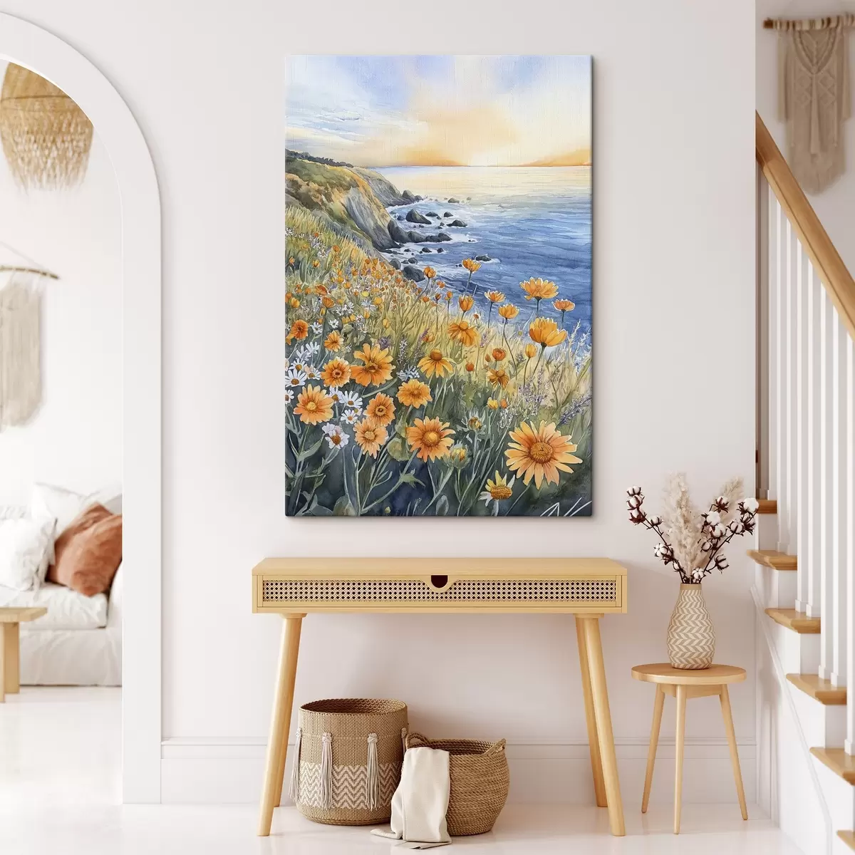 Quadri Scogliera con fiori d'arancio, costa oceanica, Portogallo, stile acquerello Nr s44604