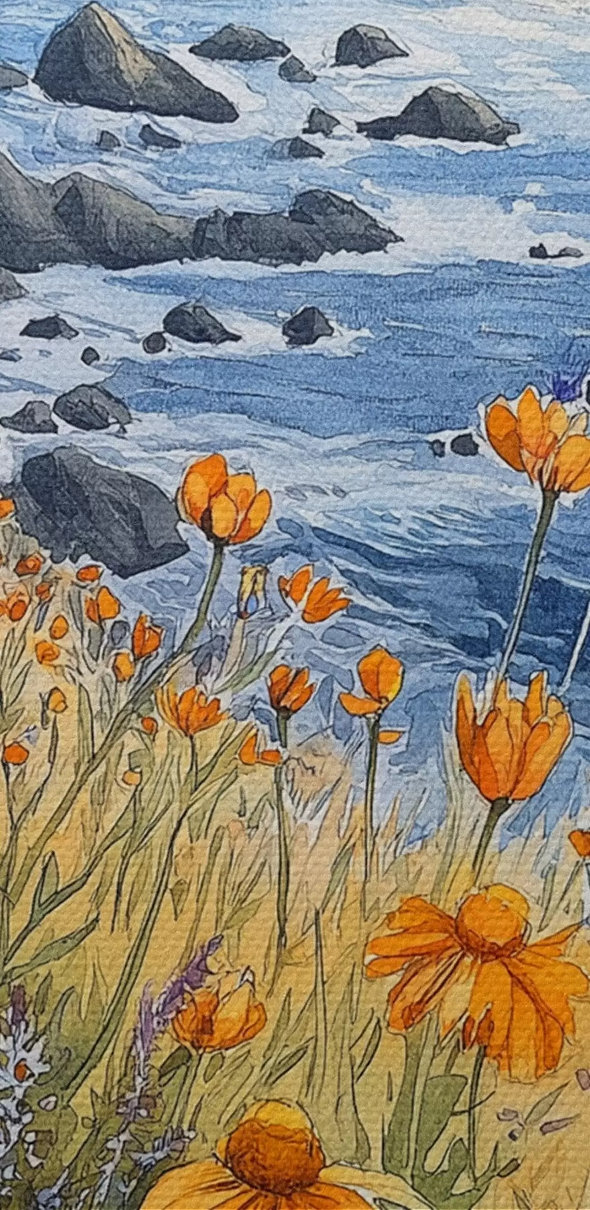carta da parati Scogliera con fiori d'arancio, costa oceanica, Portogallo, stile acquerello nr. s44604