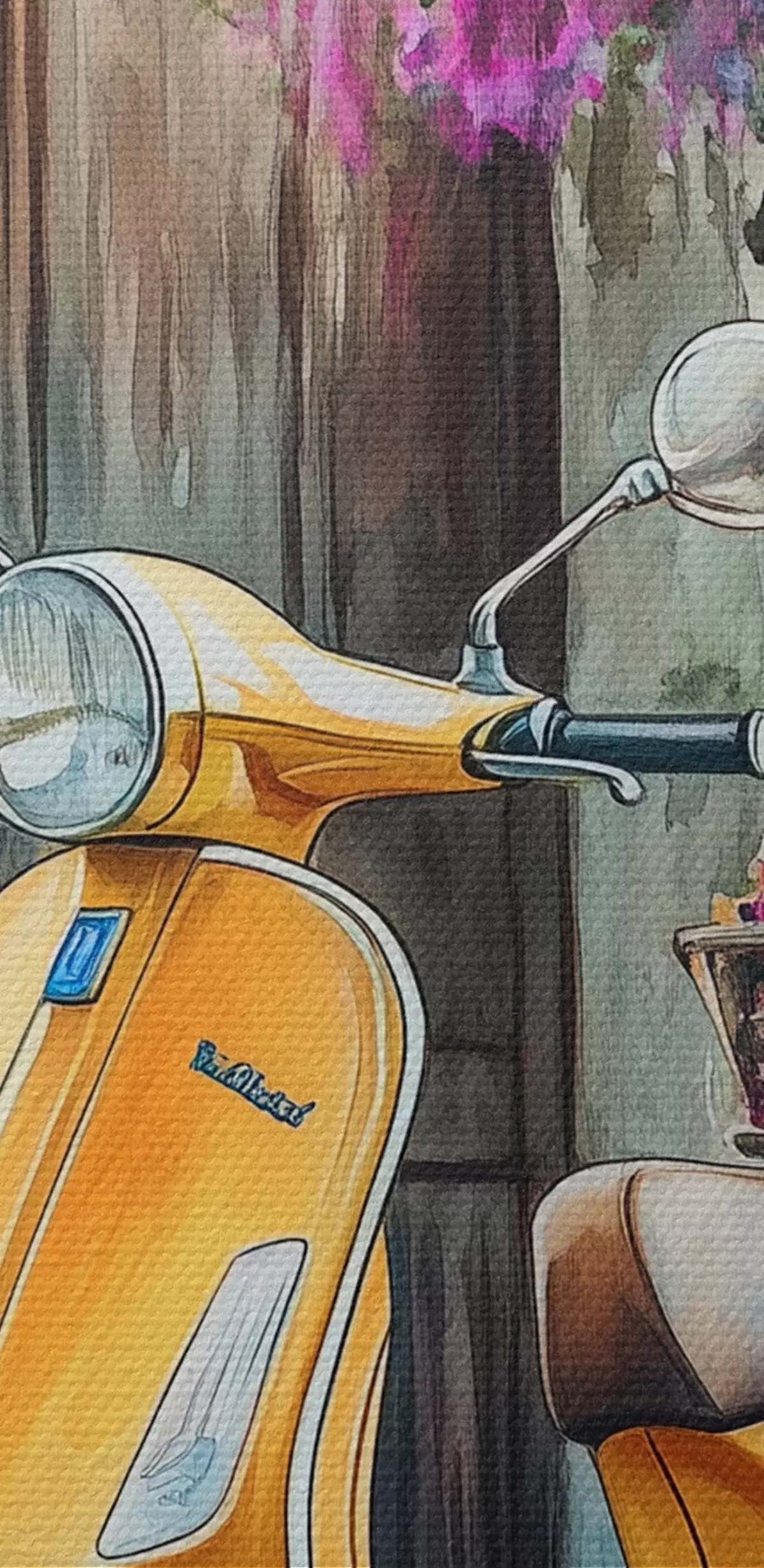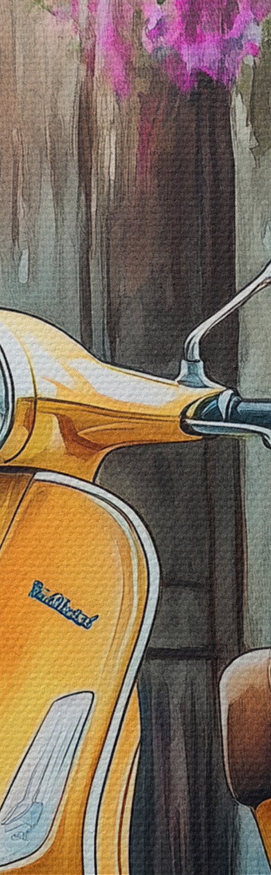Quadri Scooter giallo Vespa vicino a porta di legno con fiori Nr s44607