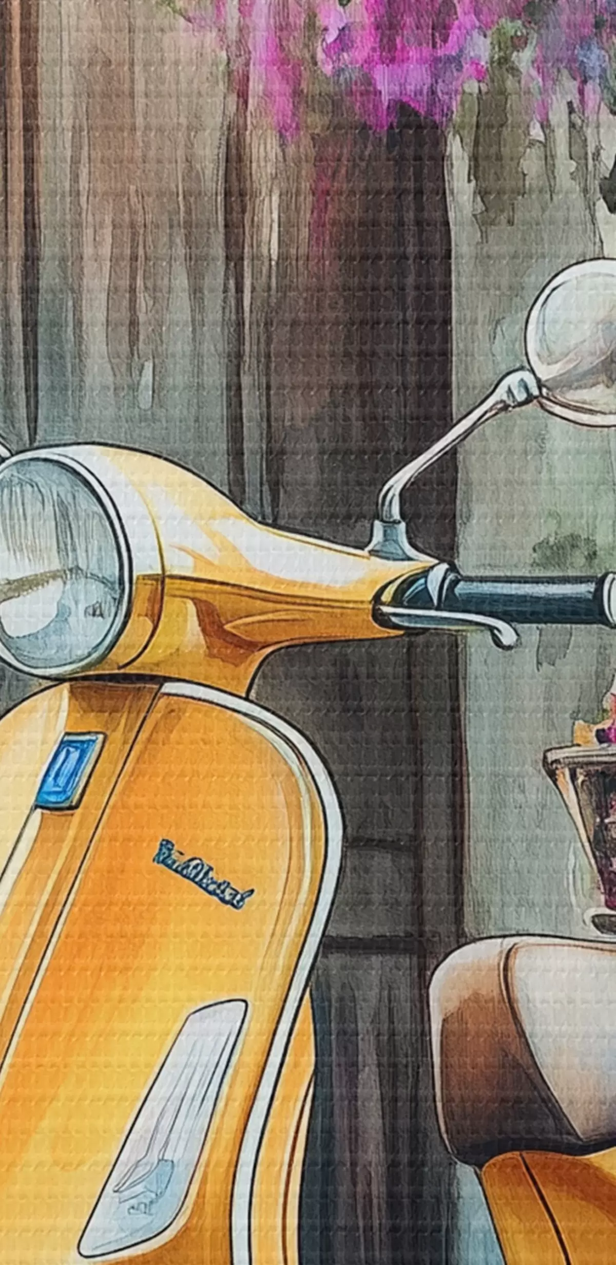 carta da parati Scooter giallo Vespa vicino a porta di legno con fiori nr. s44607