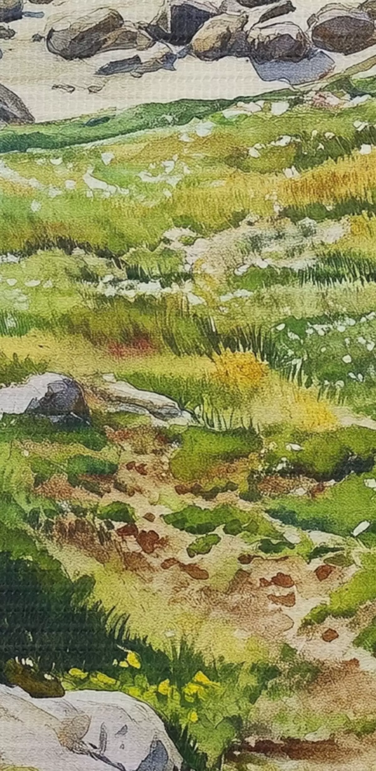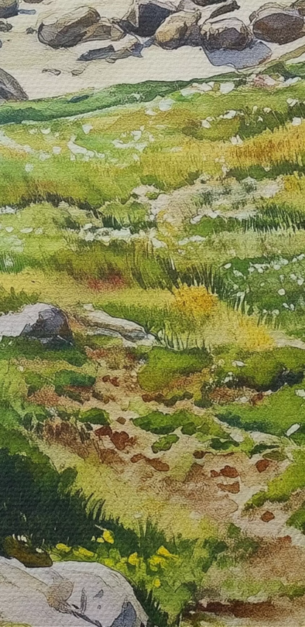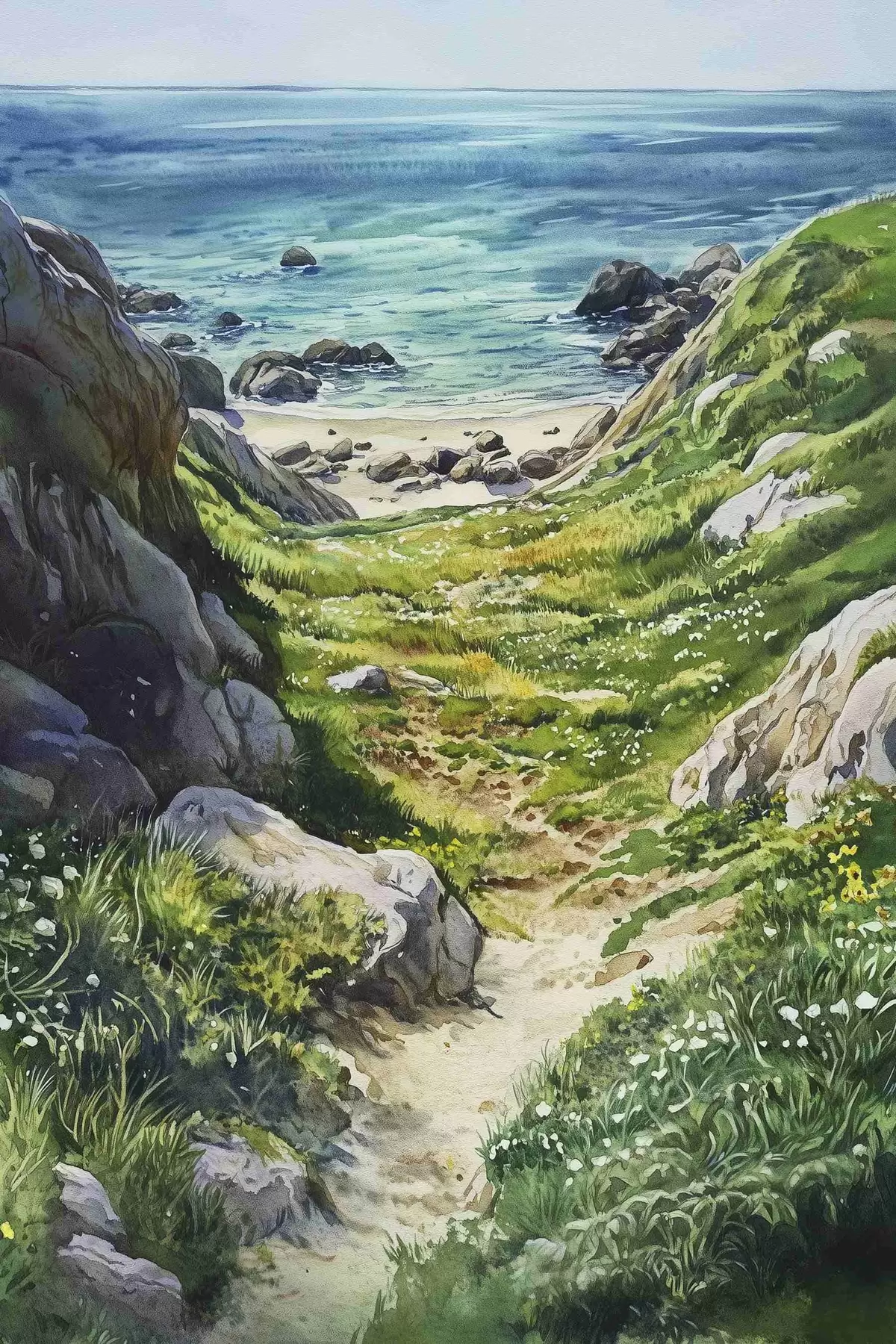 carta da parati Costa marina con rocce ed erba verde, stile acquerello, estate nr. s44616