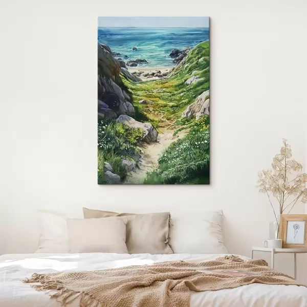 Quadri Costa marina con rocce ed erba verde, stile acquerello, estate Nr s44616