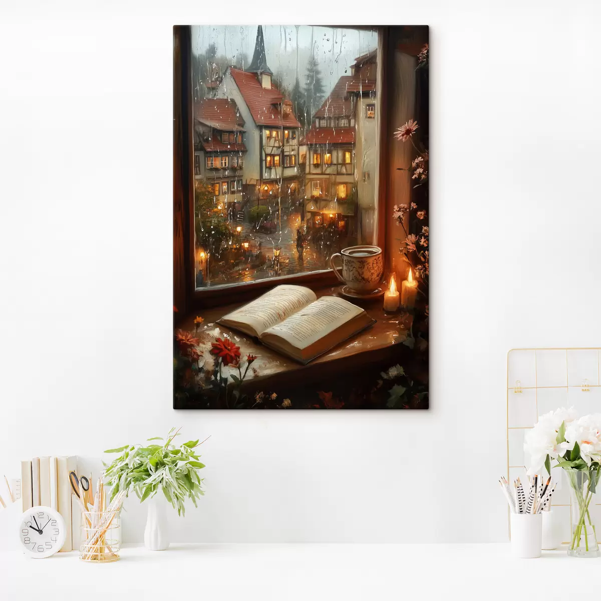 Quadri Libro sul davanzale della finestra, candele, giornata di pioggia, ambiente accogliente Nr s44722