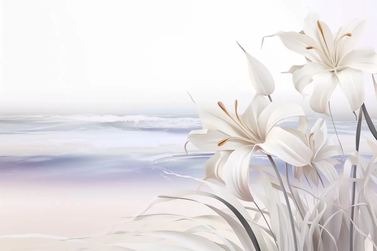 carta da parati Gigli bianchi con pistilli arancioni e foglie lunghe su una spiaggia con onde morbide sullo sfondo, colori pastello nr. s44850