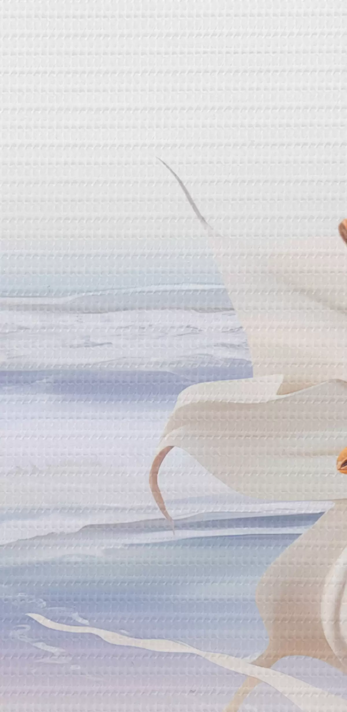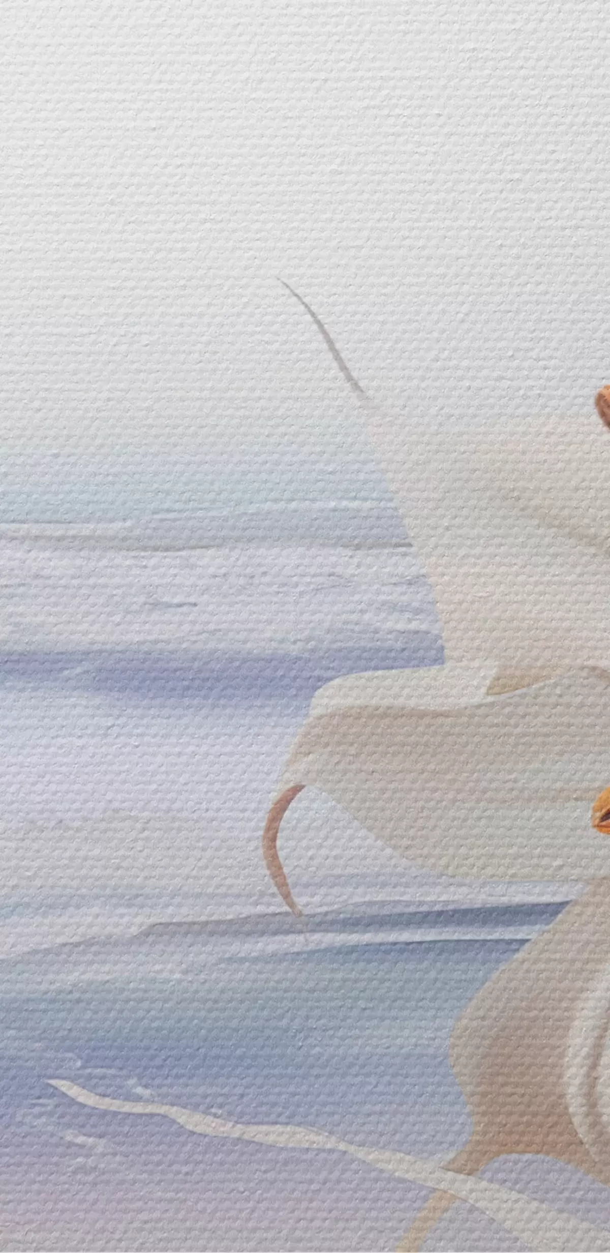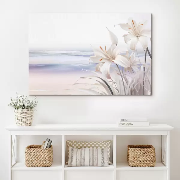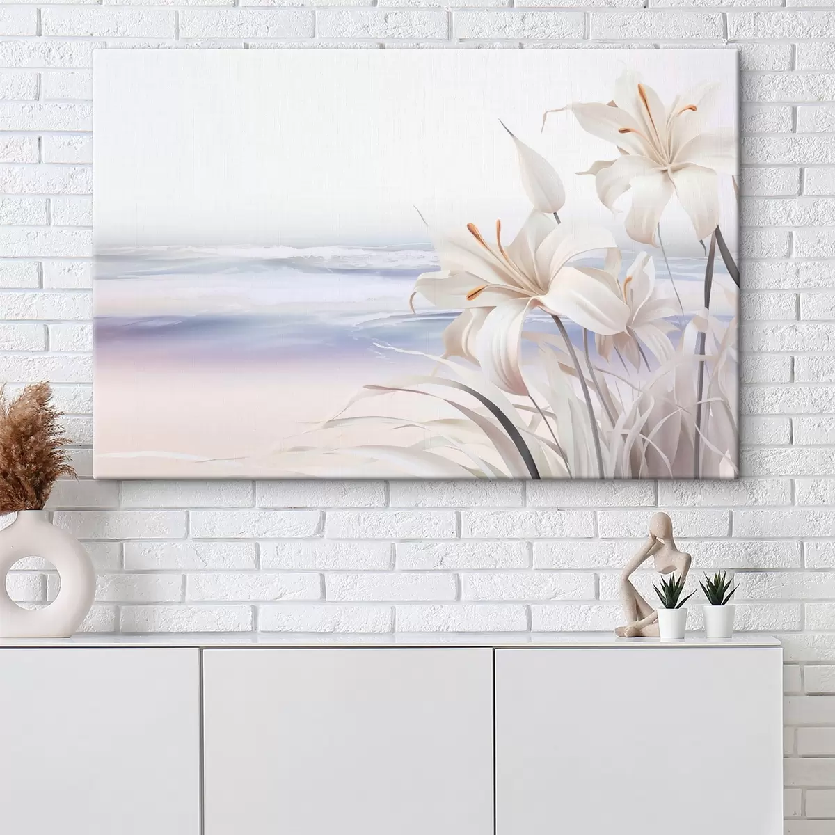 Quadri Gigli bianchi con pistilli arancioni e foglie lunghe su una spiaggia con onde morbide sullo sfondo, colori pastello Nr s44850