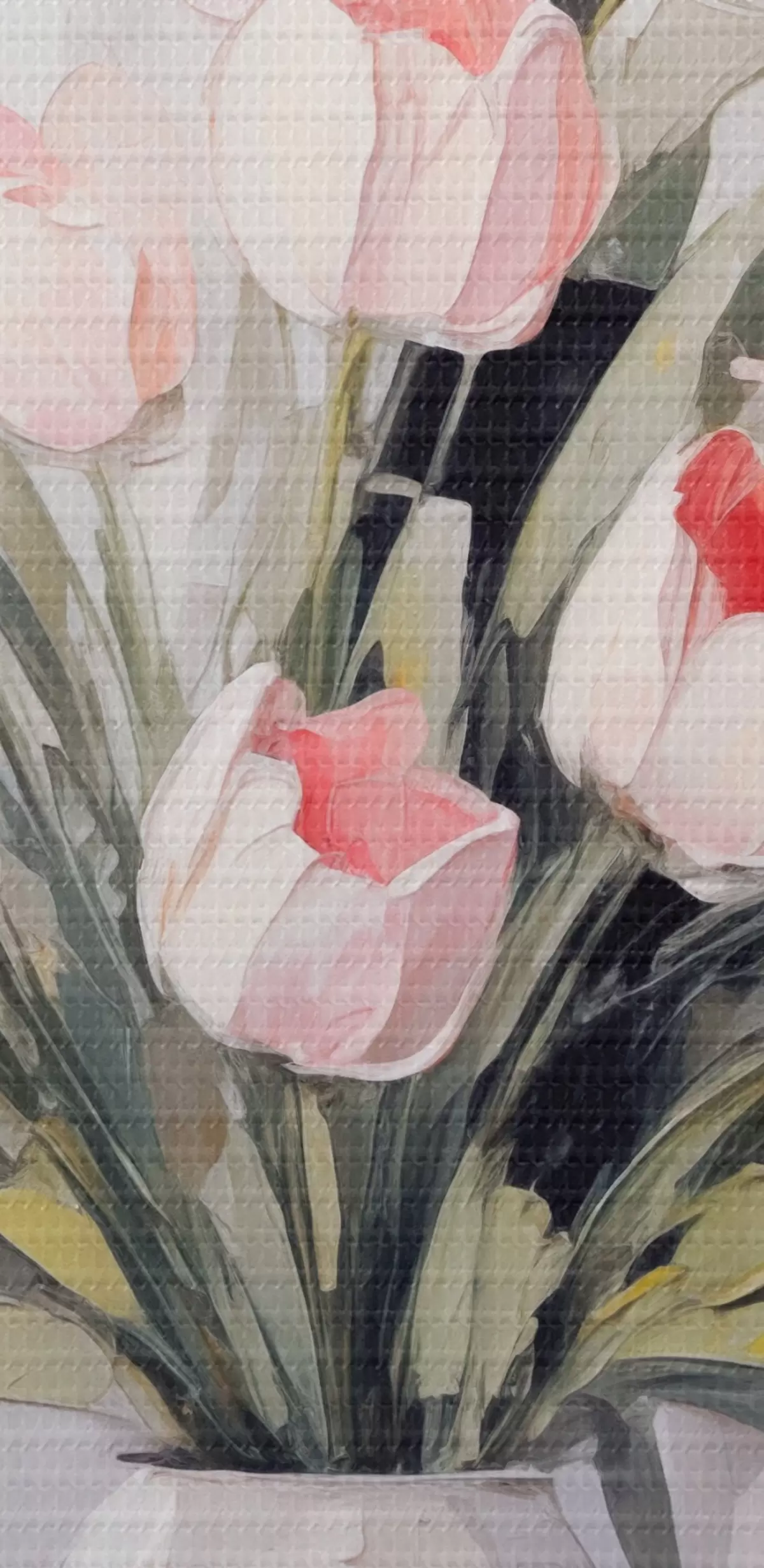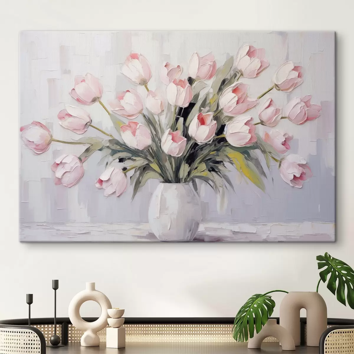 Quadri Vaso con tulipani rosa, foglie verdi, sfondo grigio chiaro, stile pittura ad olio, pennellate spesse Nr s44852