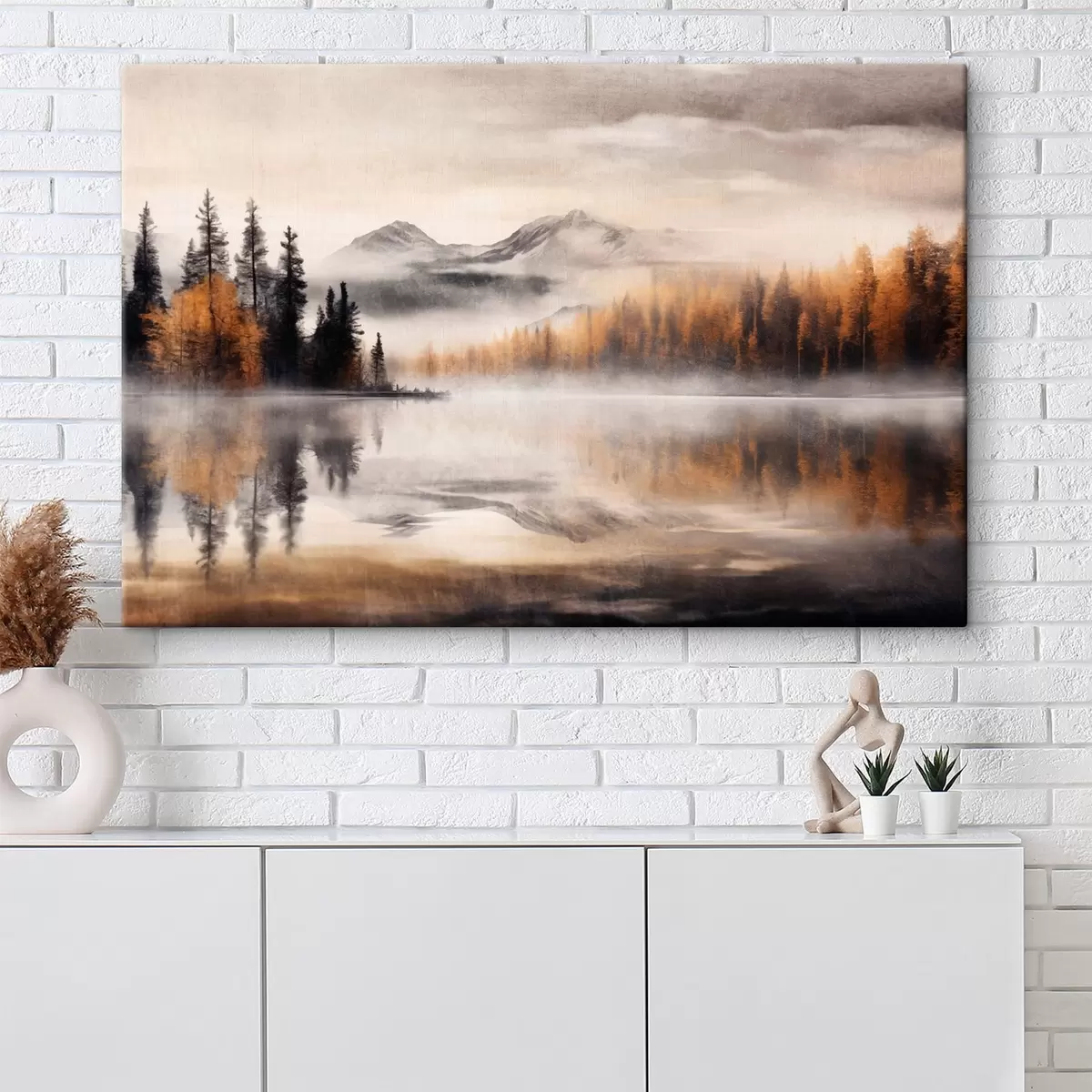 Quadri Un paesaggio lacustre dalla texture nebbiosa con pini e montagne, cielo grigio e nuvoloso Nr s44856