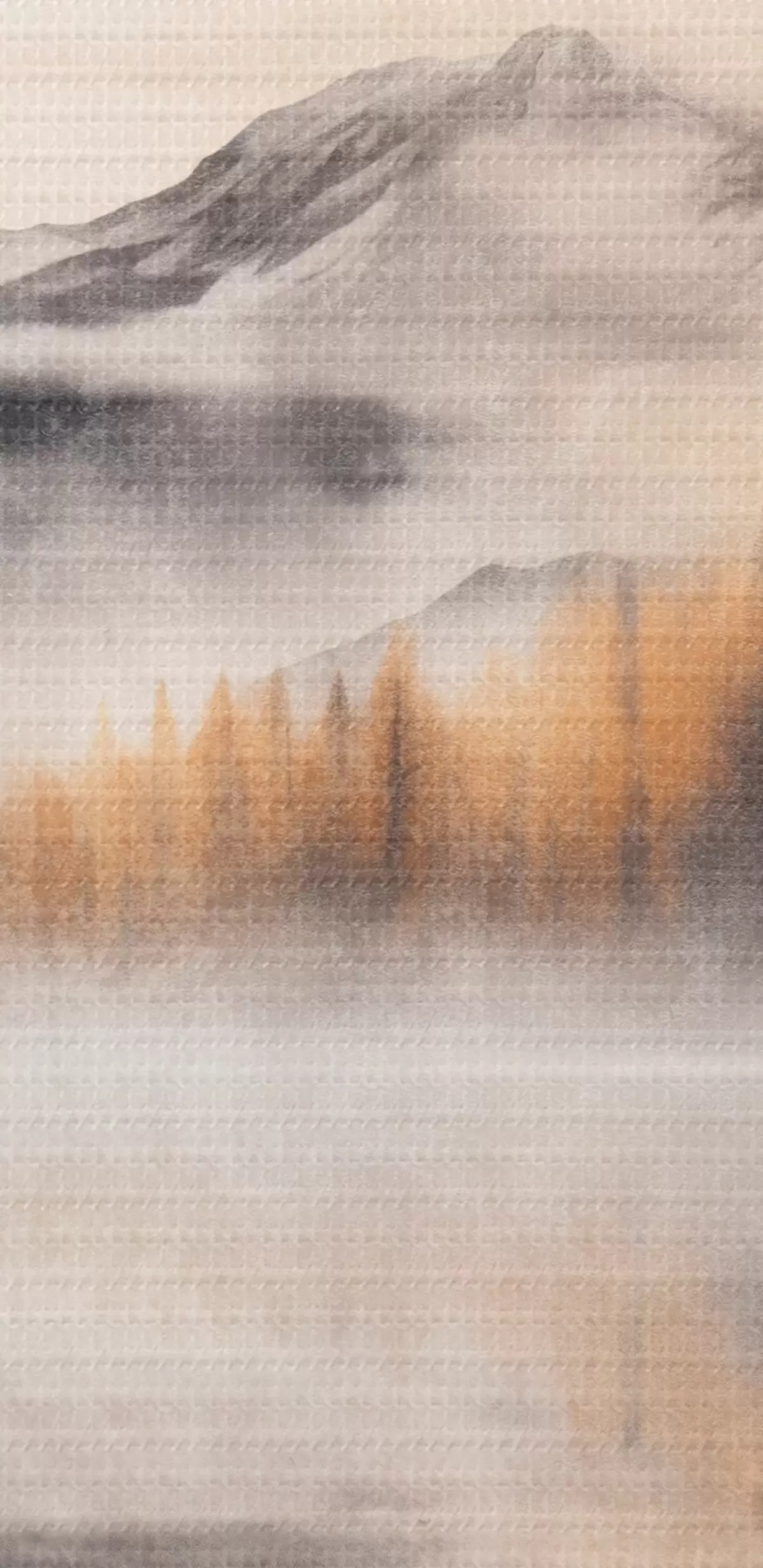 carta da parati Un paesaggio lacustre dalla texture nebbiosa con pini e montagne, cielo grigio e nuvoloso  nr. s44856