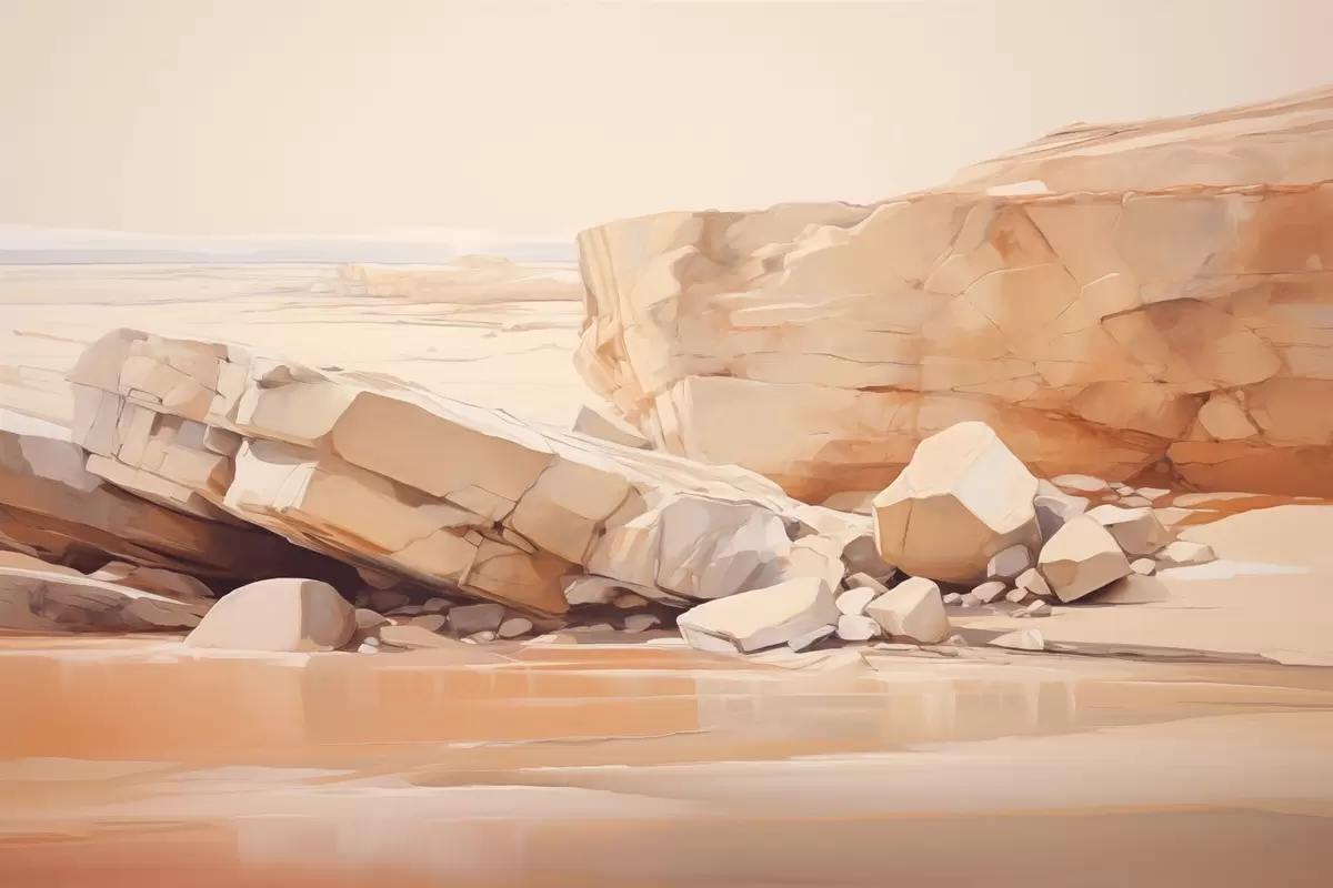 Quadri Paesaggio minimalista di spiaggia rocciosa con grandi massi marrone chiaro e acqua limpida Nr s44865