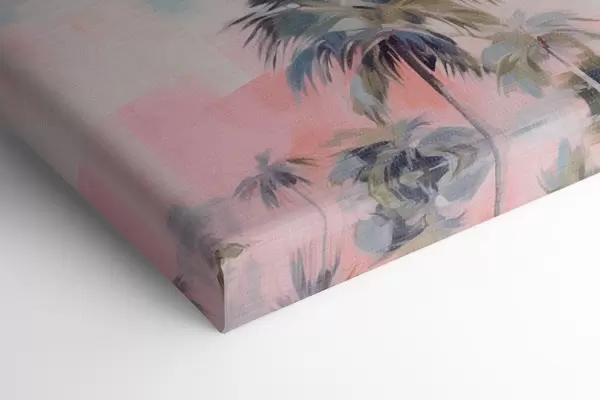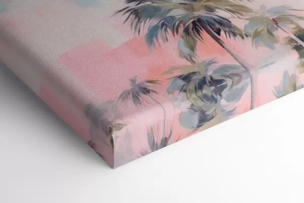 Quadri Palme con foglie color pastello e tronchi marroni, cielo rosa e azzurro, ambiente tropicale Nr s44866