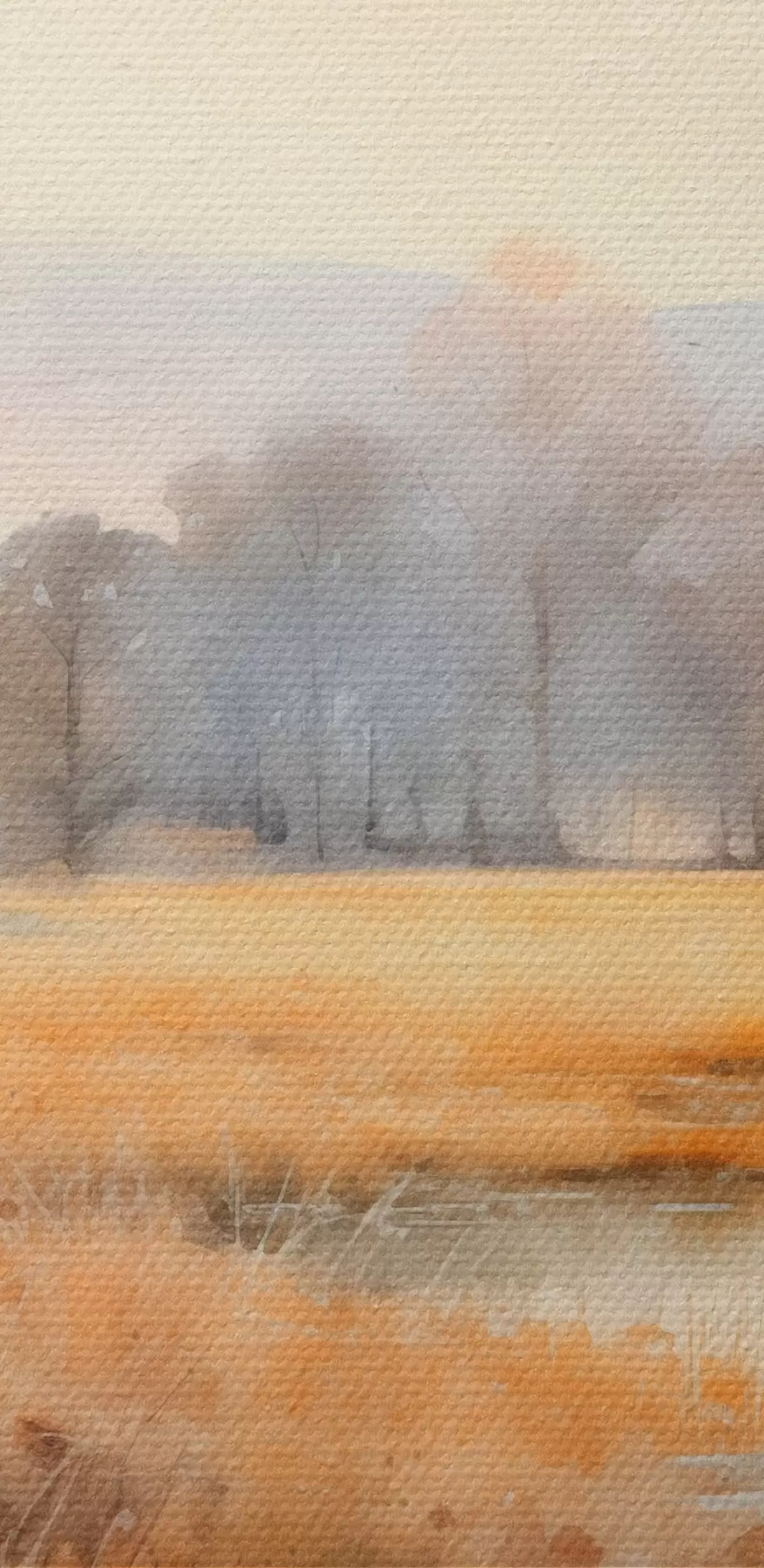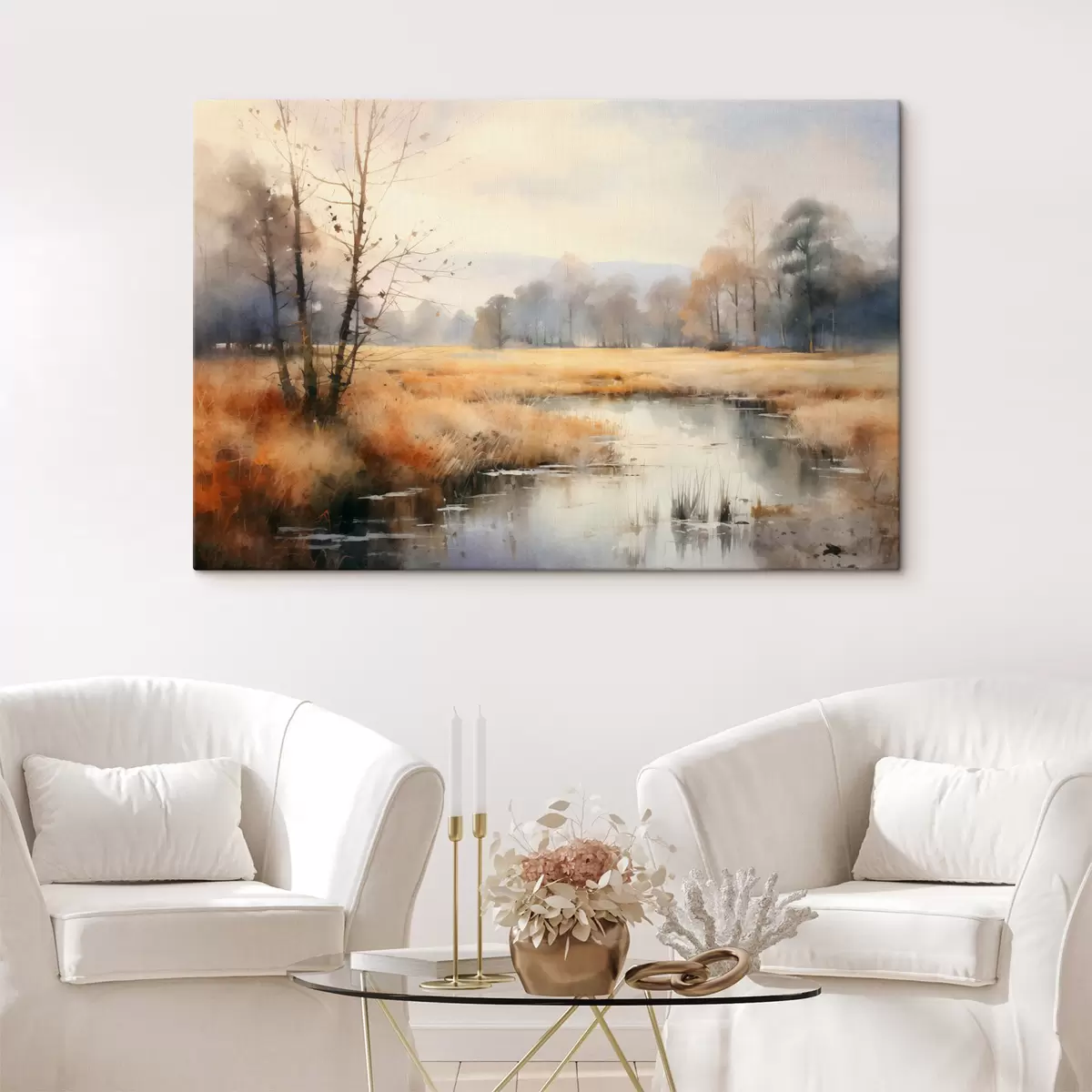 Quadri Una tranquilla pittura paesaggistica con texture ad imitazione di canne e alberi spogli, l'acqua calma sotto un cielo Nr s44867