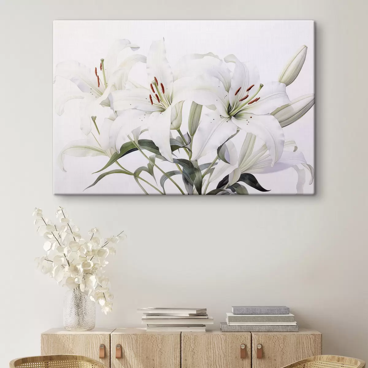 Quadri Un bouquet di gigli bianchi con foglie verdi, petali delicati e un morbido sfondo bianco Nr s44868