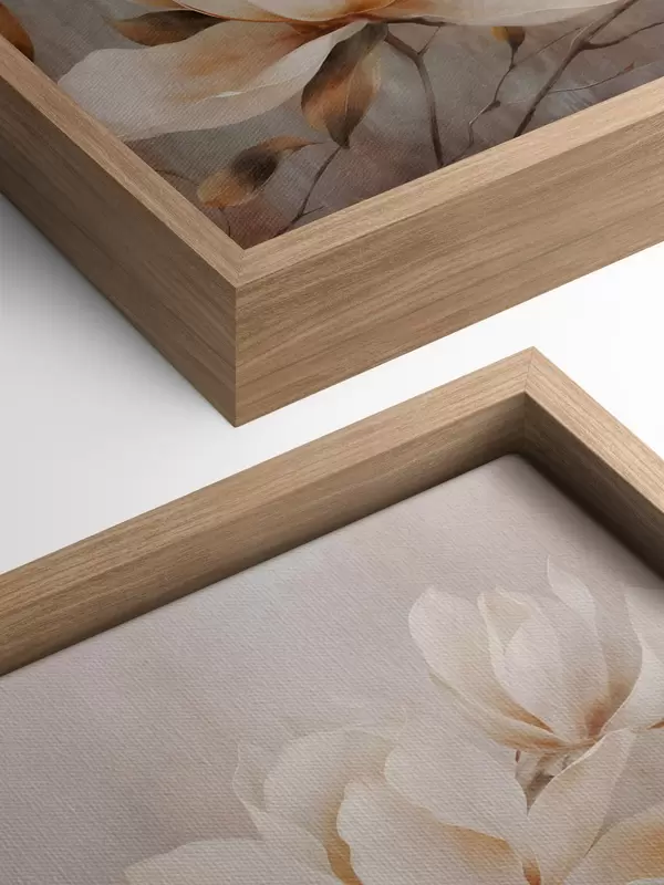 Quadri Fiori di magnolia bianchi e testurizzati su rami in uno sfondo marrone chiaro Nr s44869