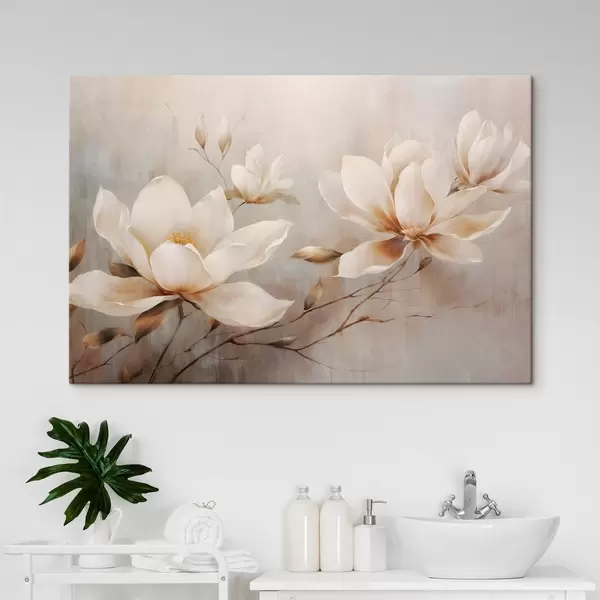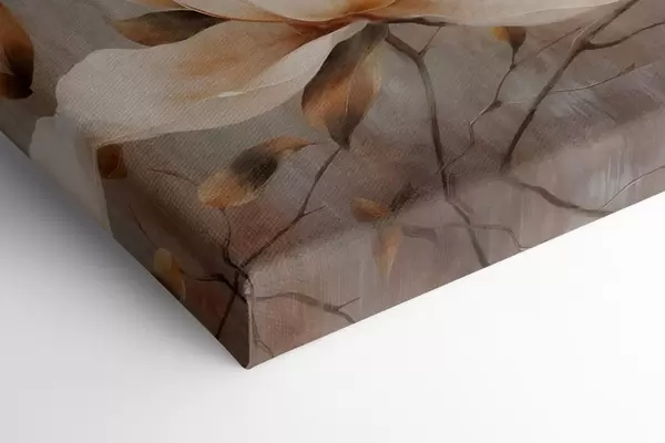 Quadri Fiori di magnolia bianchi e testurizzati su rami in uno sfondo marrone chiaro Nr s44869
