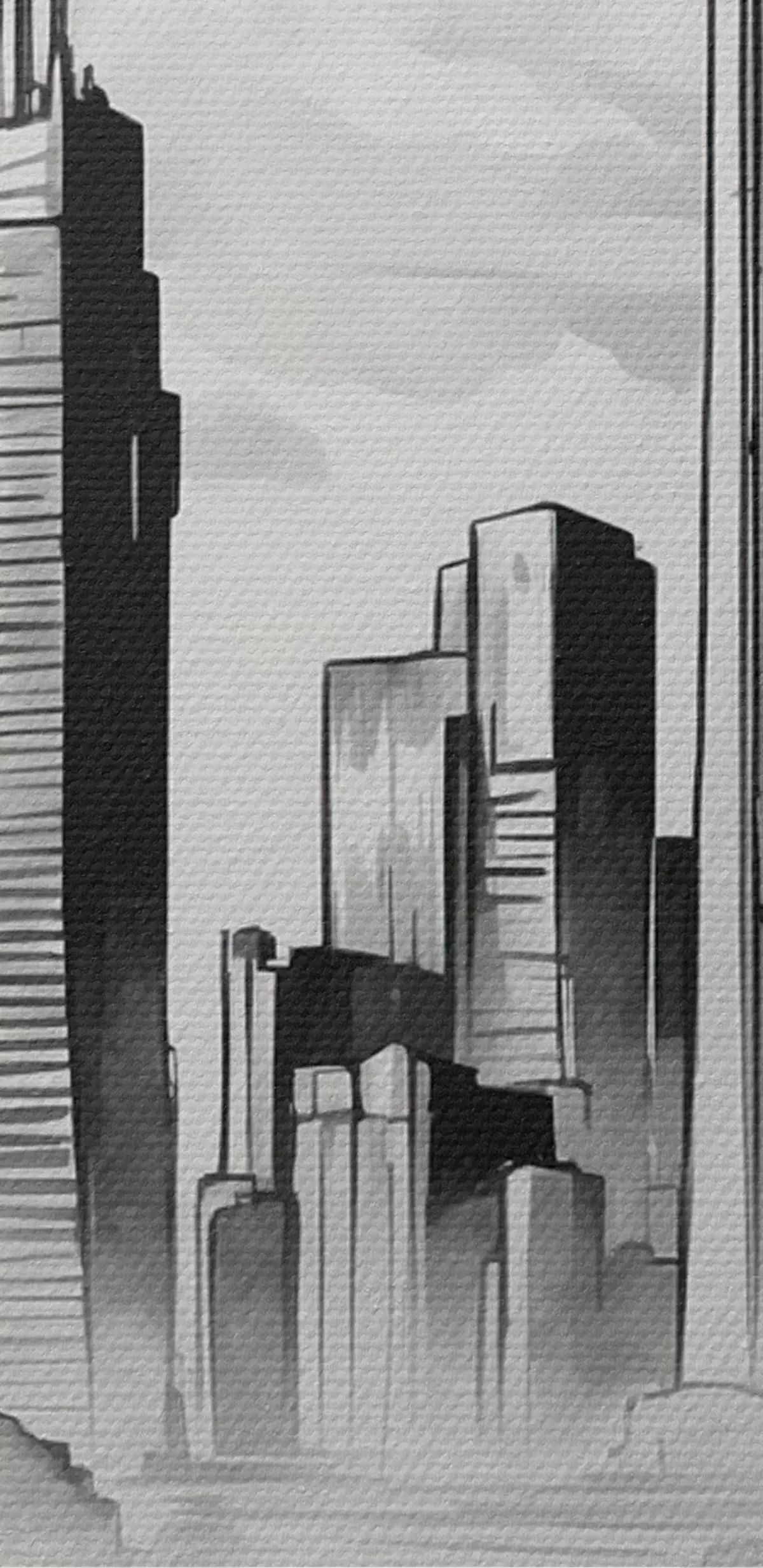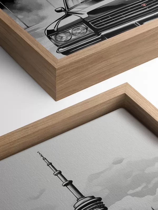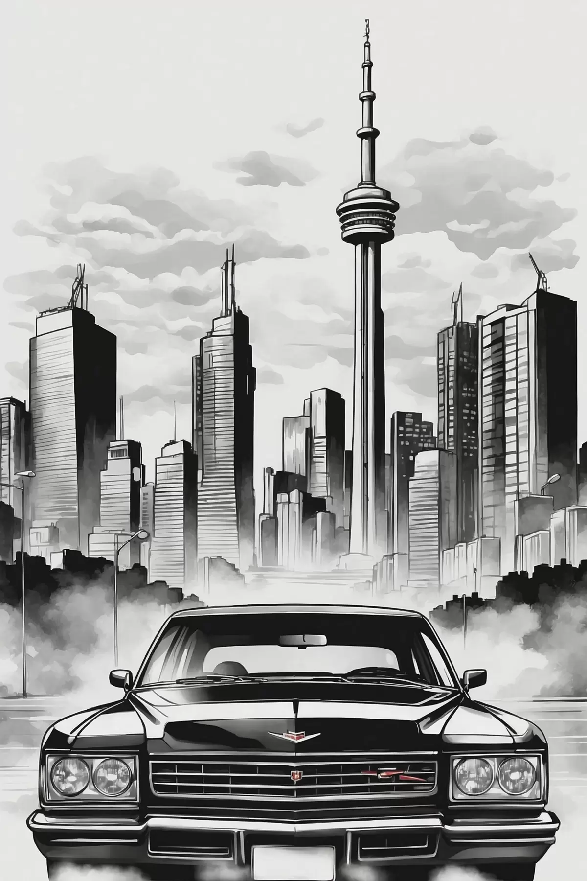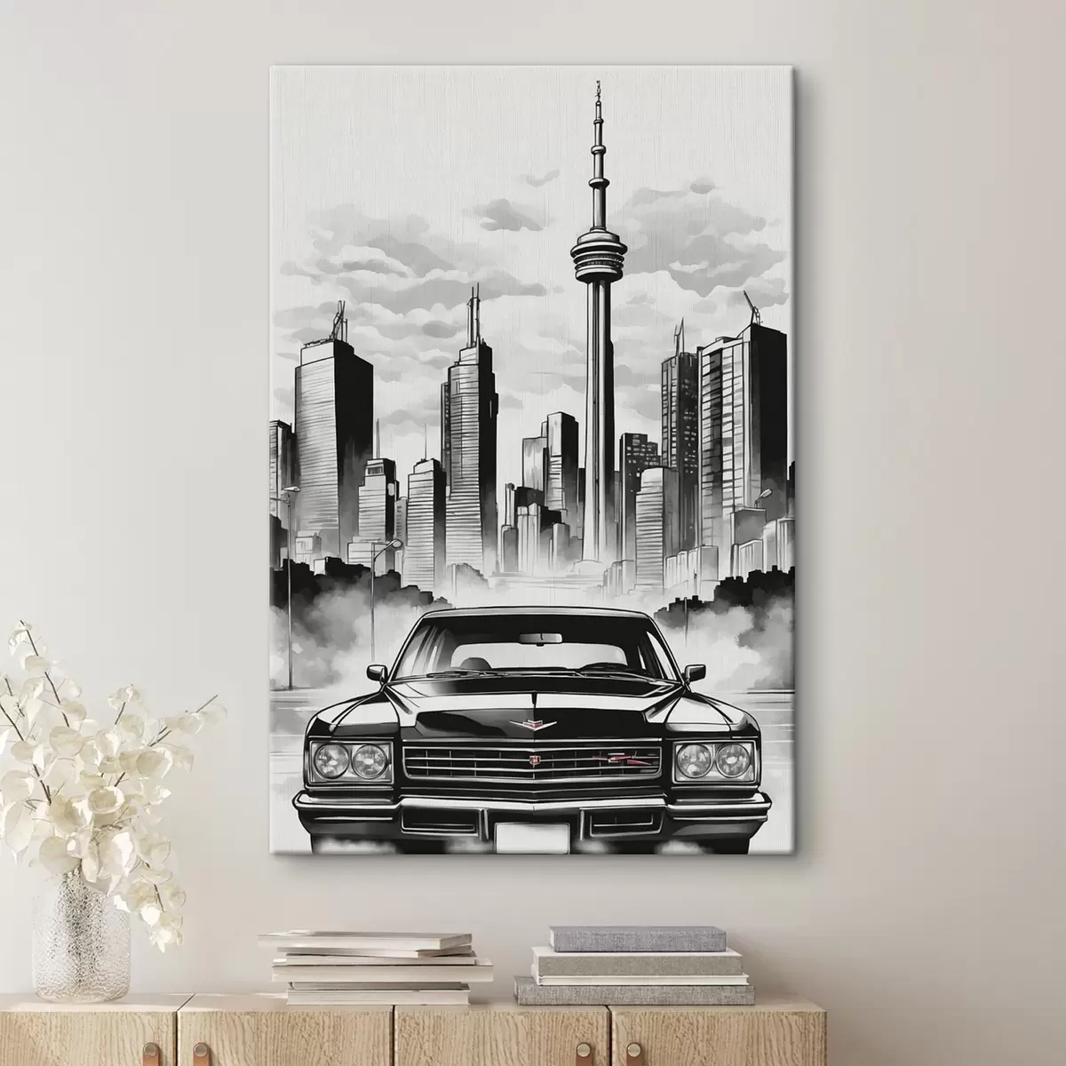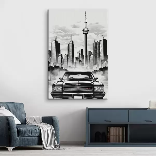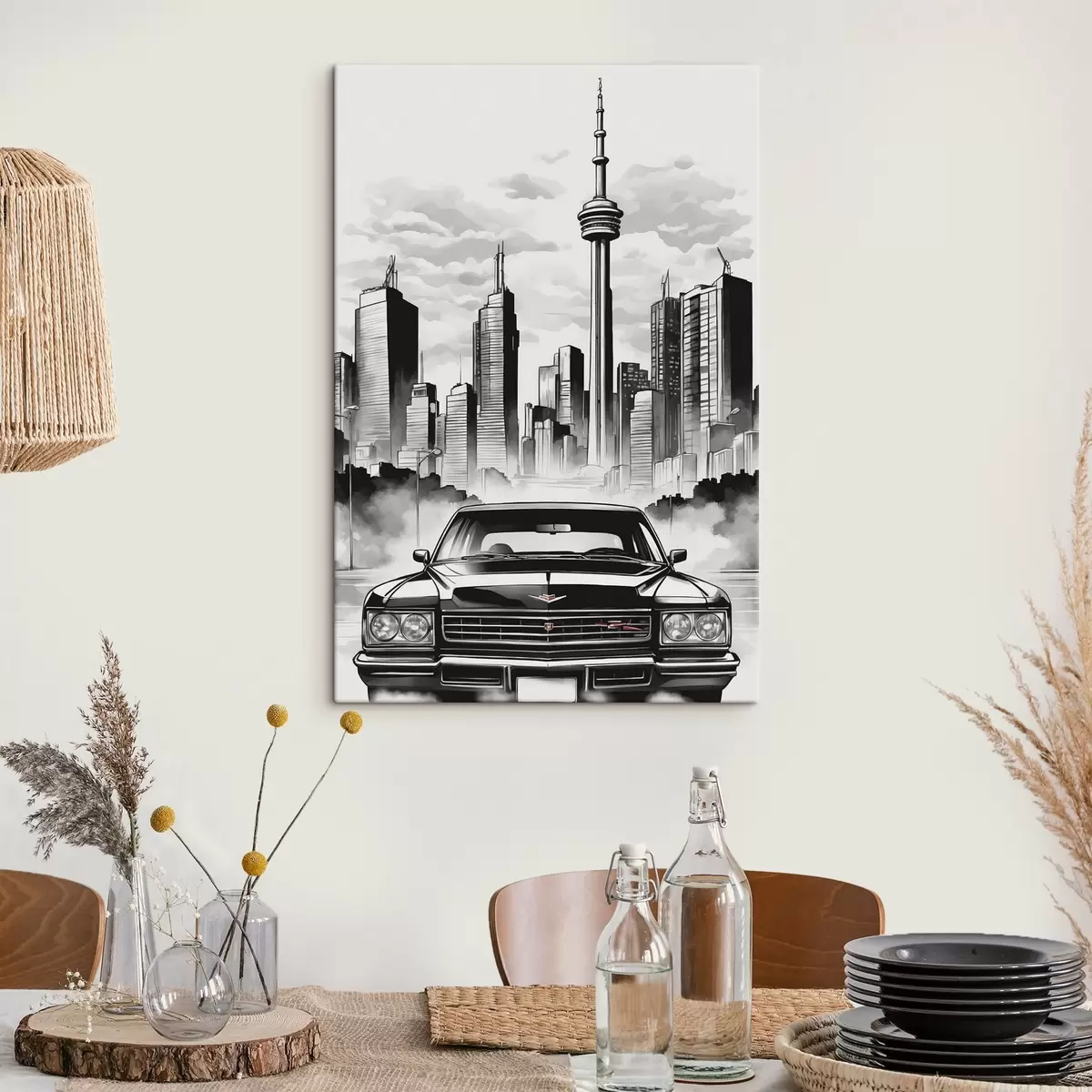 Quadri Auto retrò sullo sfondo di città monocromatica con grattacieli Nr s44871