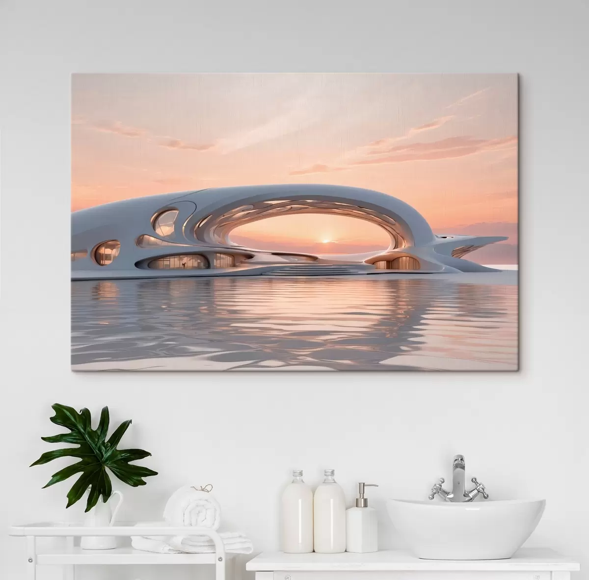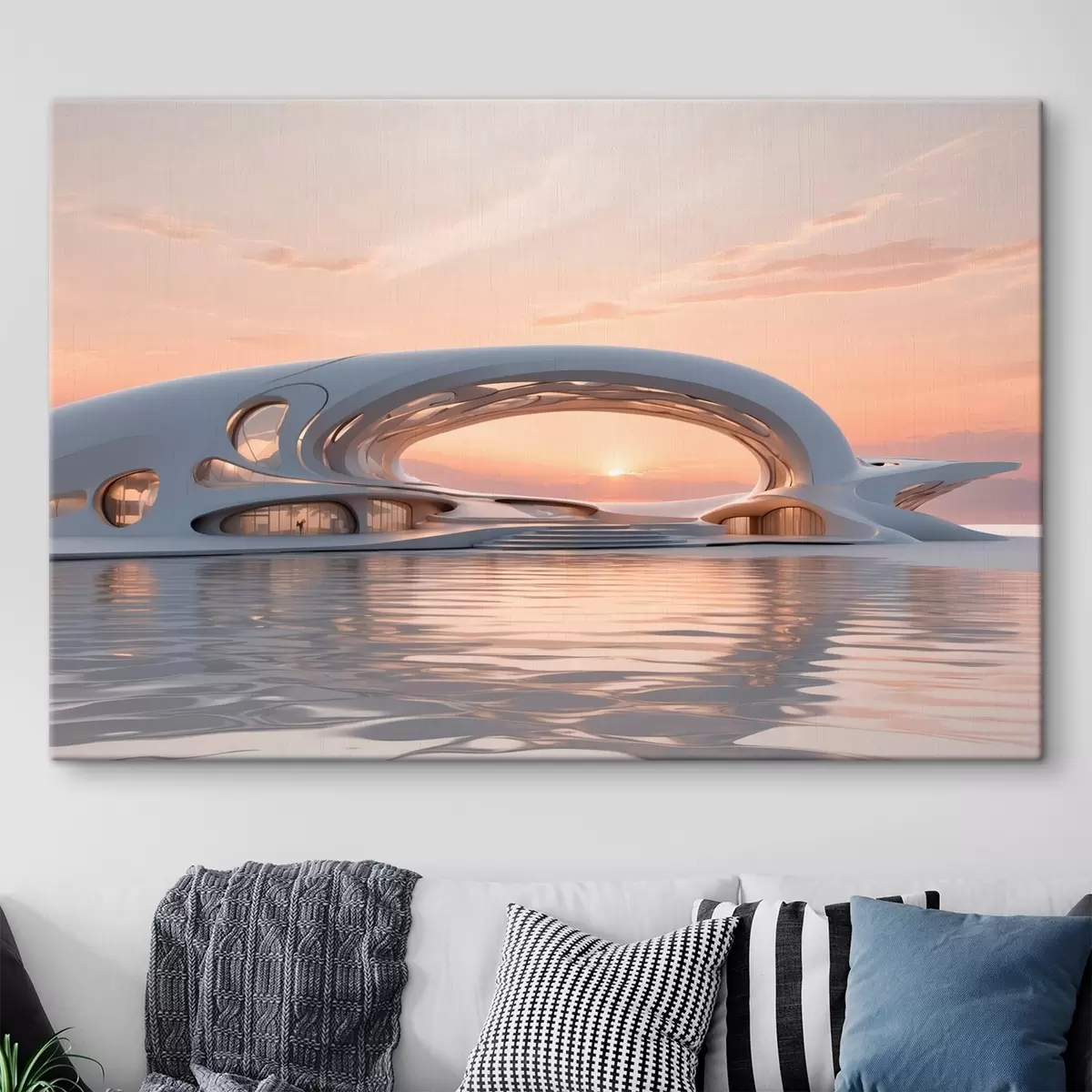 Quadri Edificio futuristico sull'acqua contro un tramonto rosa Nr s44884